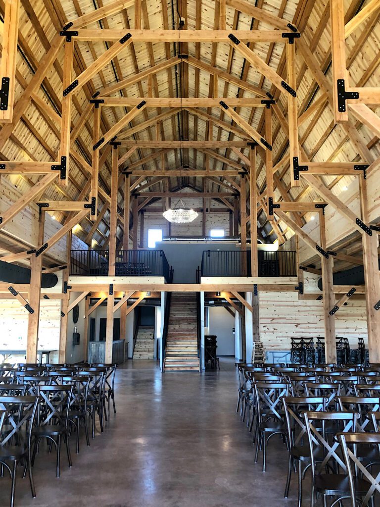 Inside, the soaring main space includes room for 330 people, along with a bar, a warming kitchen for caterers, a groom’s den and restrooms.