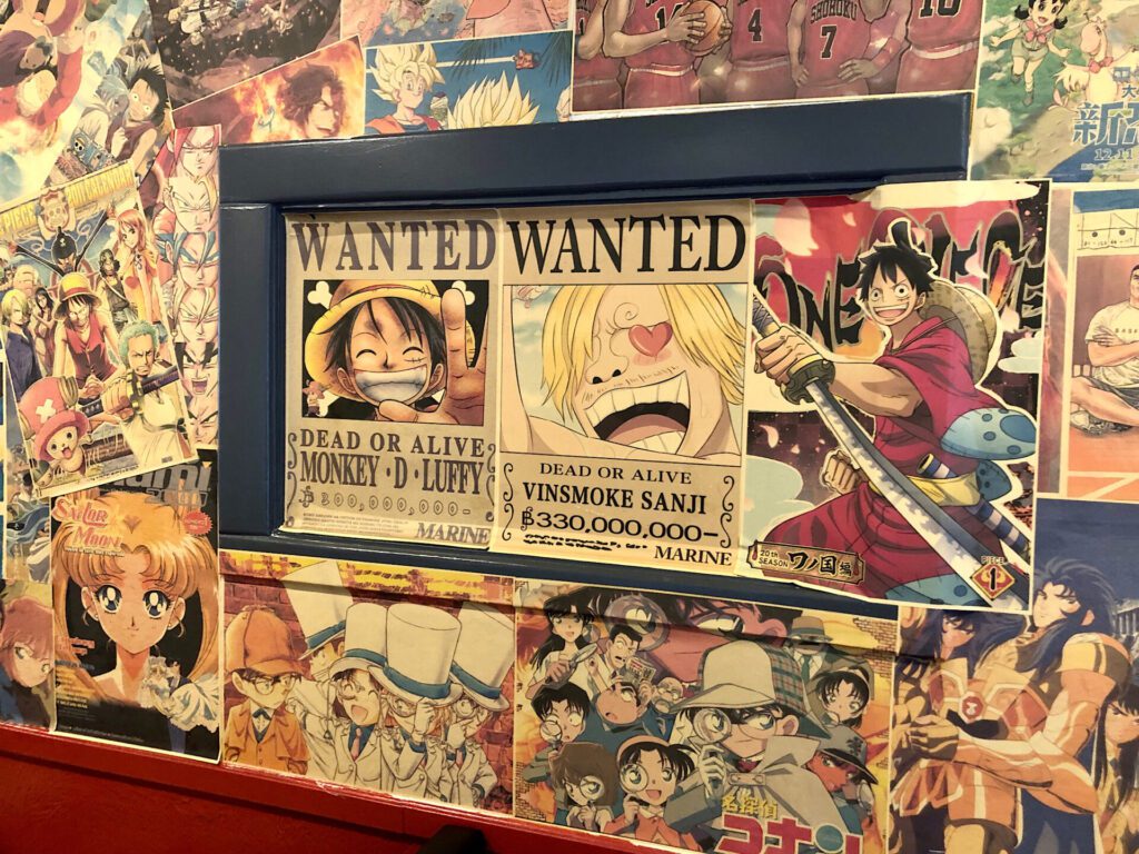 Wallpaper in one of the two dining areas features anime graphic art, and posters show some of the menu items.