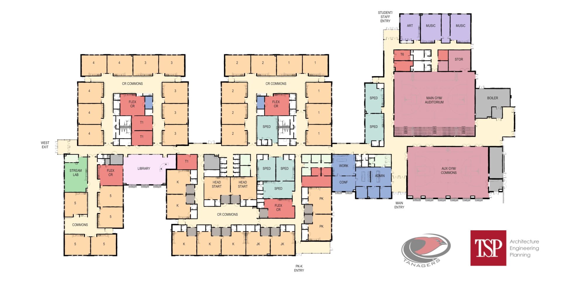 The school will feature a multipurpose room that will function as a cafeteria and auxiliary gym. It also will incorporate outdoor classrooms to help reinforce the modularity of each wing and allow for easy compartmentalization of different building sectors.
