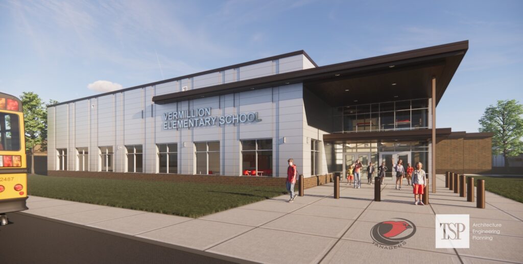 The new Vermillion Elementary School will be connected to the existing middle school and is planned for five sections each of pre-kindergarten through fifth grade. It will include two classrooms each for junior kindergarten, Head Start and preschool in addition to six special education rooms.