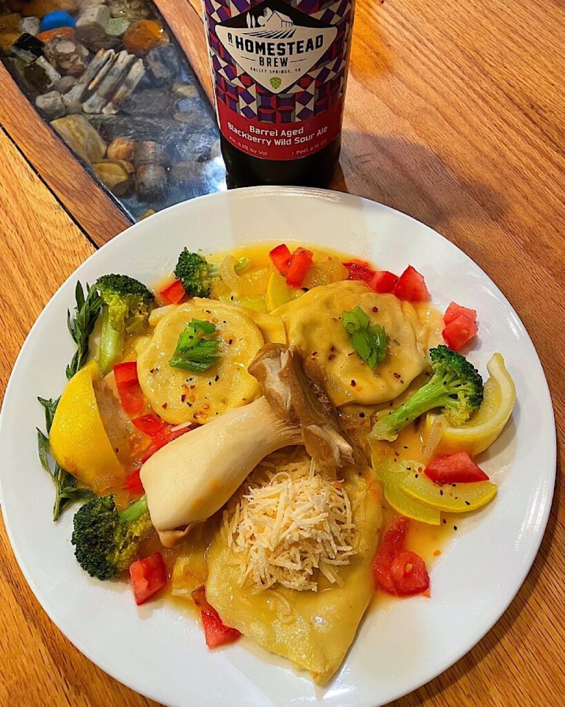 Experimenting the other day, he created a smoked duck ravioli, making the pasta by hand. He paired the duck with trumpet mushrooms from Dakota Mushrooms & Mircrogreens and made a sauce with a hand-foraged sage and lemon beurre blanc, deglazing the pan with homemade plum wine.
