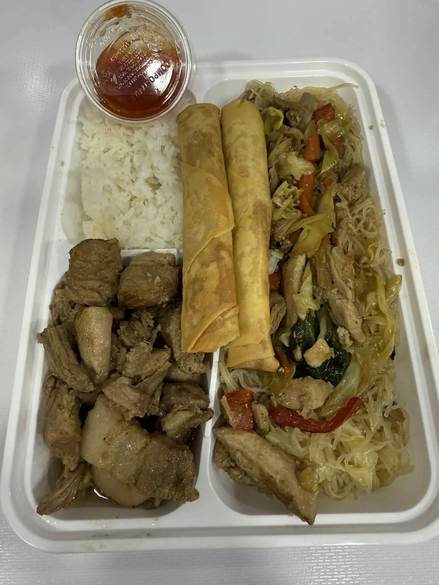 Pancit is a stir-fry with rice noodles, chicken and vegetables. Adobo is pork simmered in a soy, vinegar and garlic sauce. The meat is served with steamed rice and two lumpia.