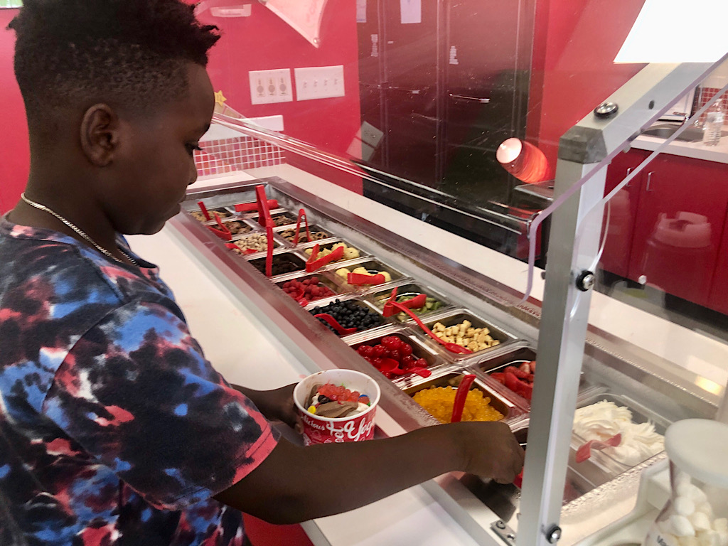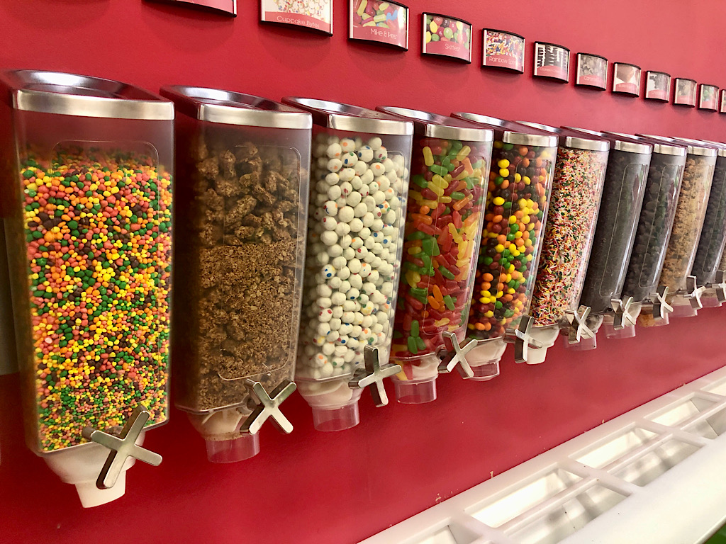 Toppings include cookie dough balls daily. The most popular frozen yogurt favors are “tried-and-true chocolate and vanilla, cookie dough, and cookies and cream,” Maksym said. “So the basics are always moving.”