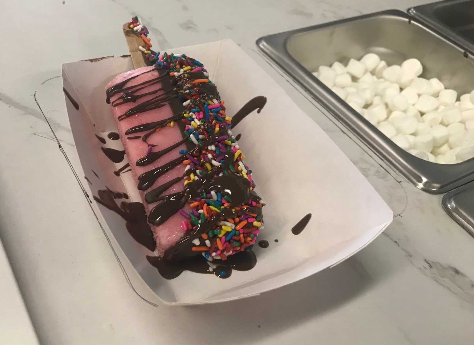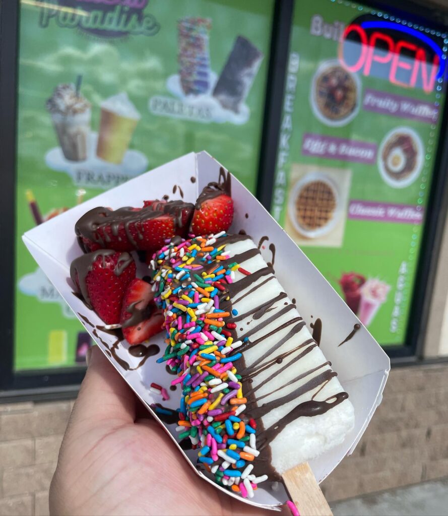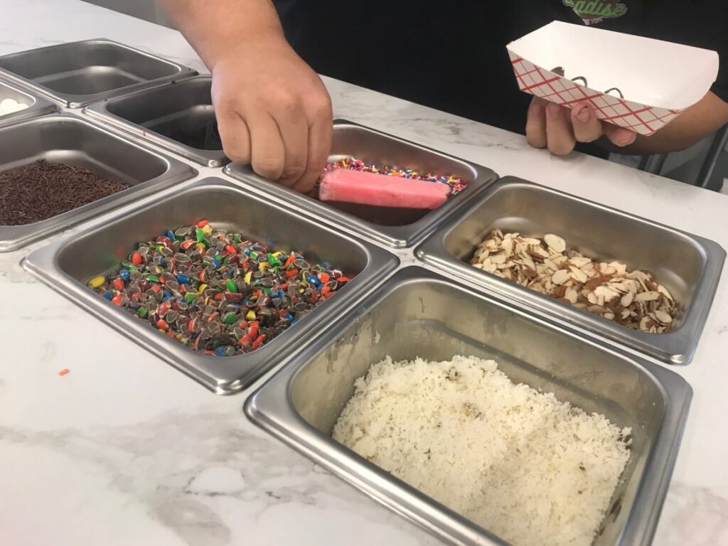 Paletas look like popsicles but are made with fresh fruits such as strawberry and mango and secondary ingredients like milk or condensed milk. They can be enjoyed on a stick, like popsicles, but adding some of the extras offered at Paleta Paradise means they must be served in a rectangular dish.