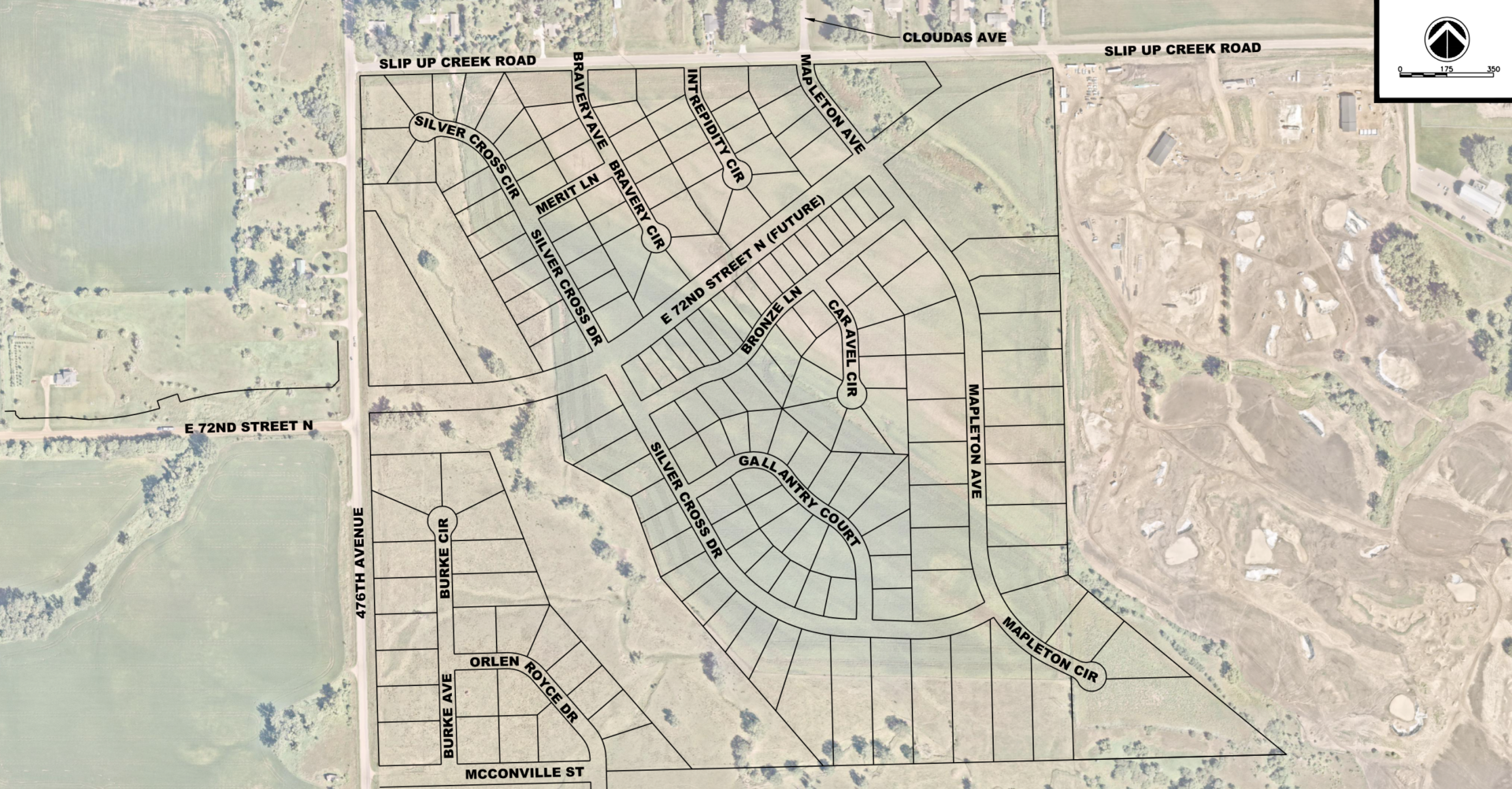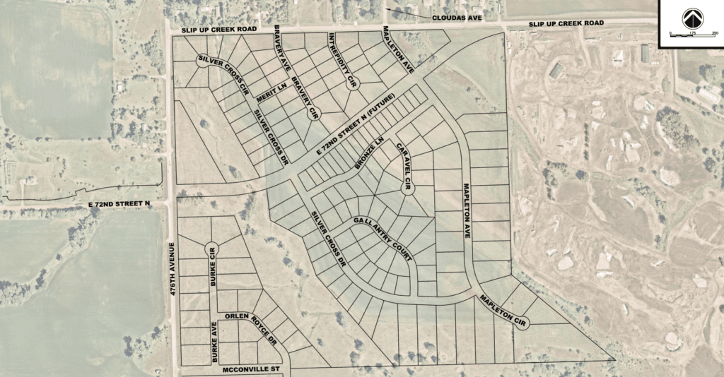 A nearby industrial development is anchored by the headquarters for Maguire, while the South Dakota Veterans Cemetery sits to the north, and the intersection of 72nd Street North and 476th Avenue is envisioned as a major commercial area.