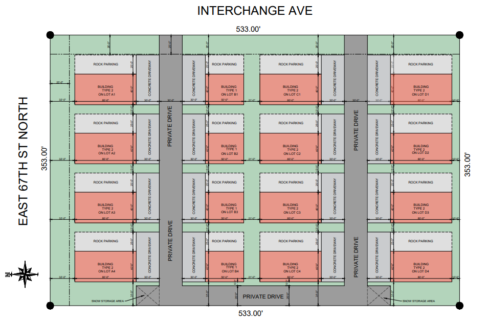 The concept calls for 12 buildings at 3,200 square feet and four at 2,000 square feet. Utilities are provided to each lot, and an association provides road maintenance, lawn care and snow removal.