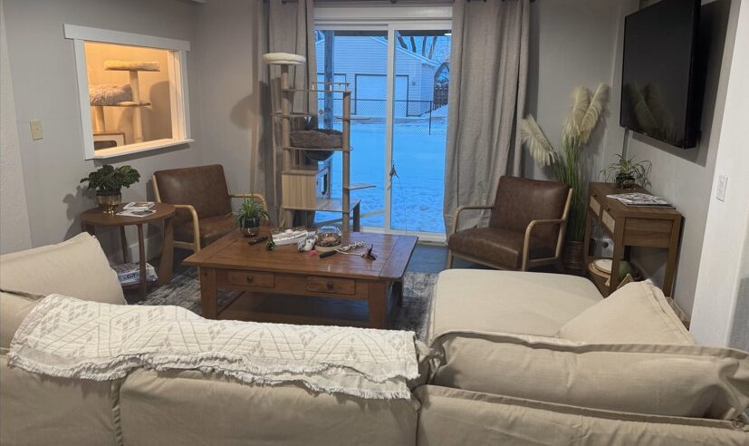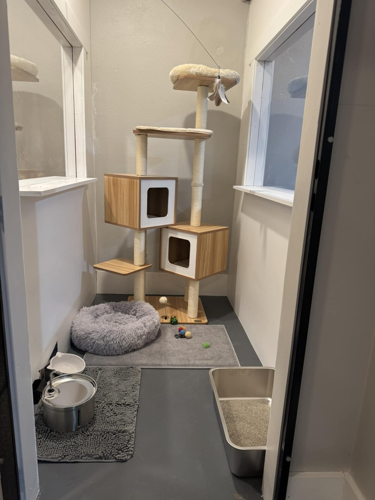 The builder constructed six suites 4-by-6-feet in size, each with their own cat tree, litter box, water fountain, toys, rugs and bed. Each suite has its own window, and this spring a fully enclosed roof “catio” will be added. Exterior windows also will be added later this year to bring more sunshine into the building.