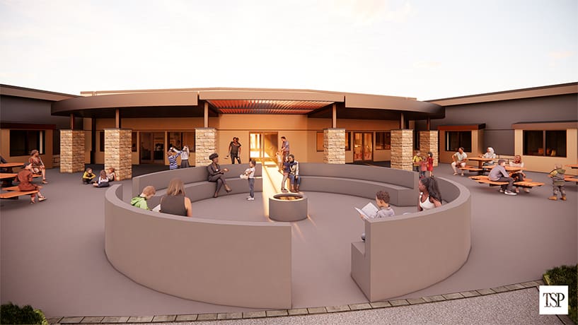 The exterior of the building will feature a welcoming facade with a landscaped gathering area, outdoor seating and a fire pit at the rear, providing families with a place to relax and connect.