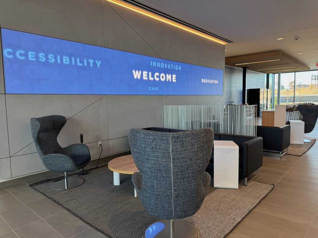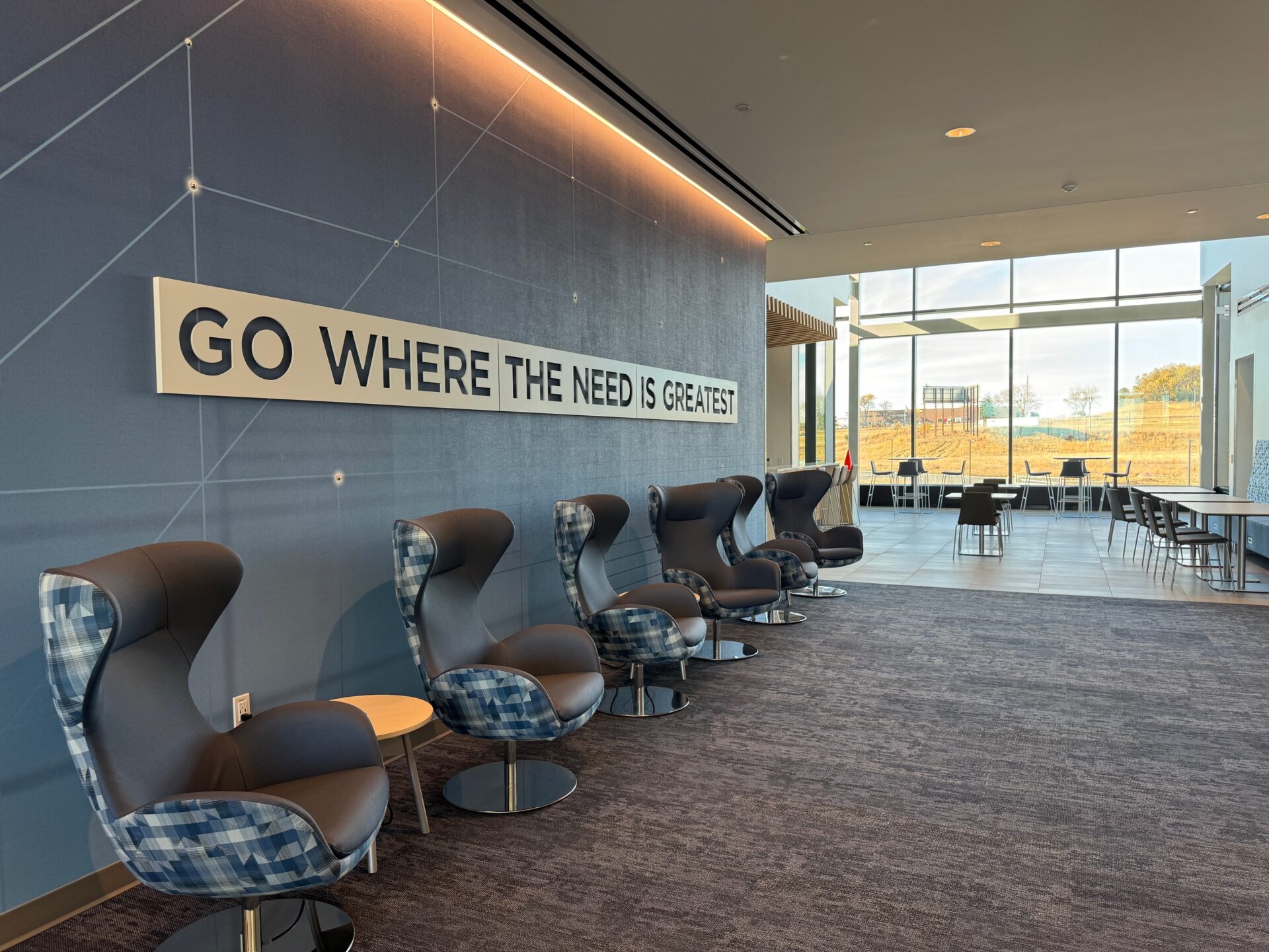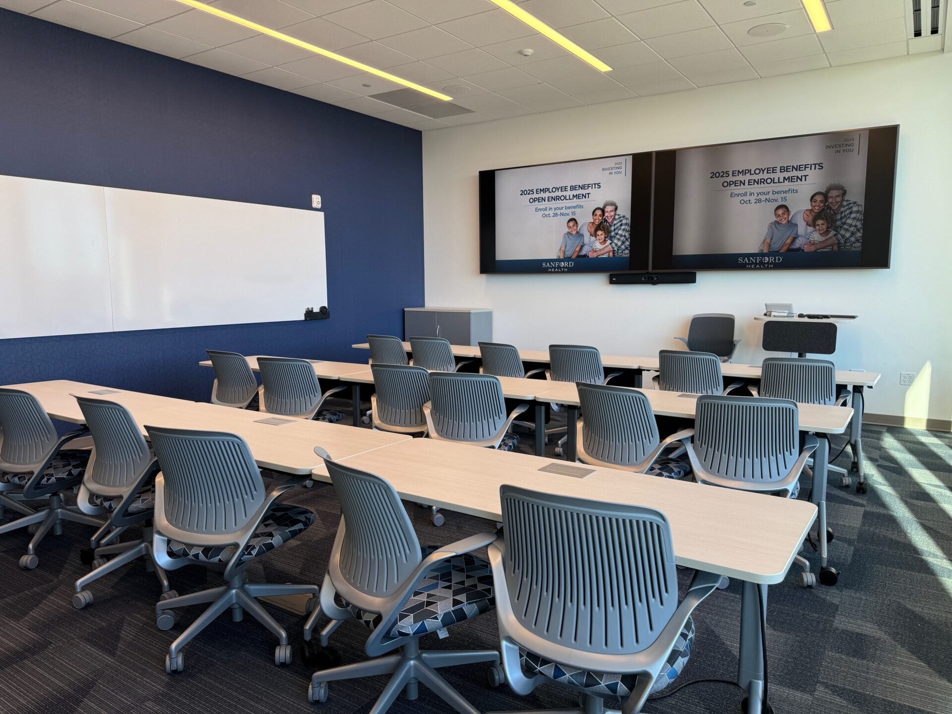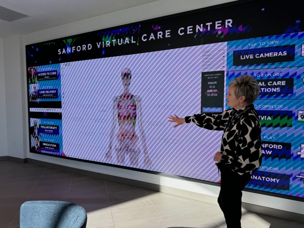 Inside, a large interactive wall — think of it as a digital dashboard — serves as a focal point in the entry, highlighting Sanford Health sites from throughout its geography and doubling as a teaching tool around areas such as human anatomy.