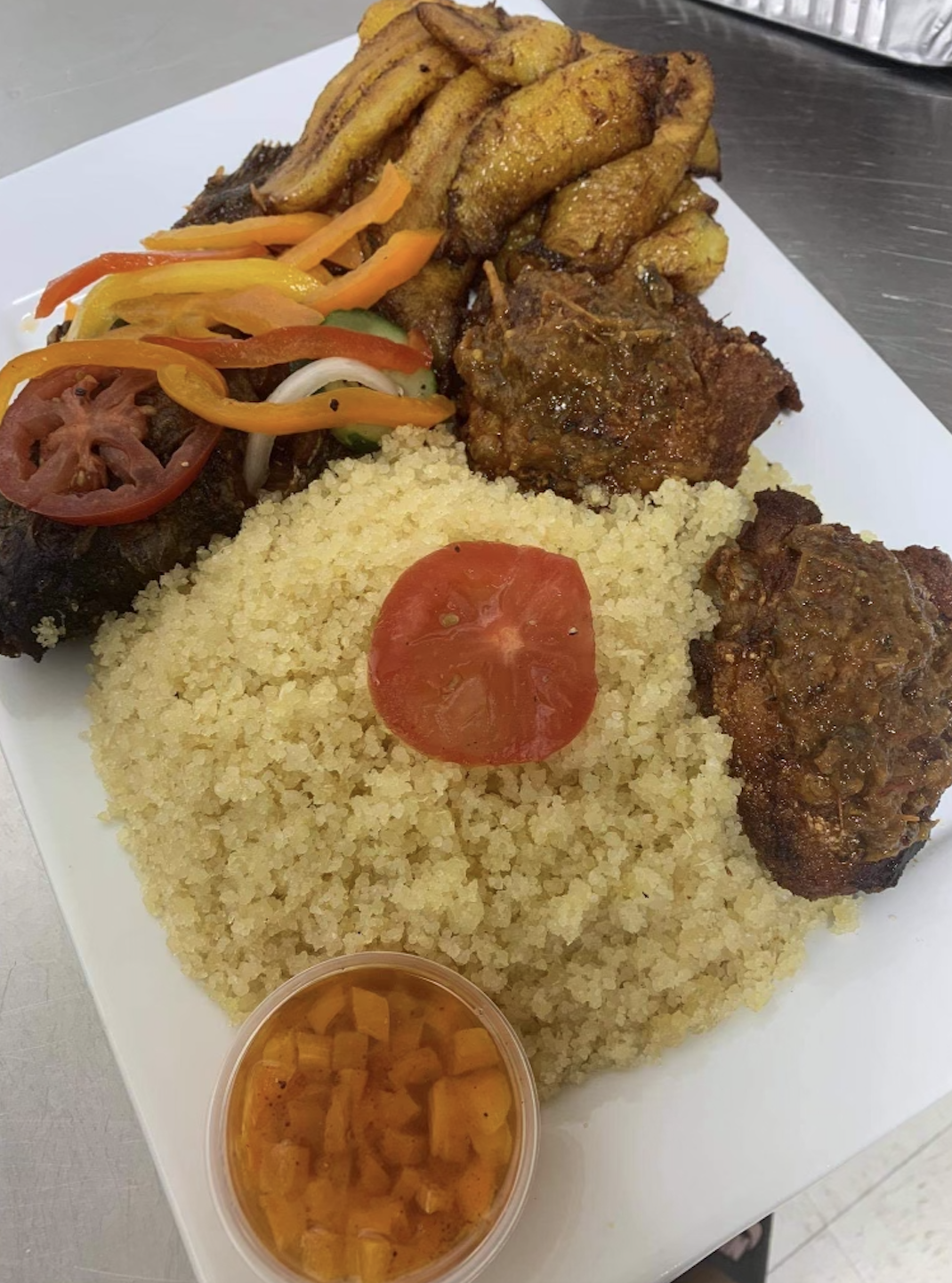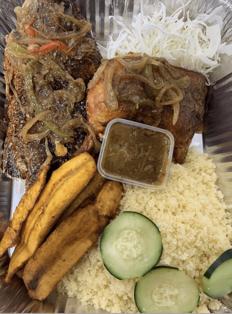 The menu includes staple West African dishes such as fried rice and chicken, cassava leaf, potato greens, fried plantains and fufu, which is a dough made from starchy foods such as cassava, yams or plantains that have been boiled, pounded and rounded into balls.