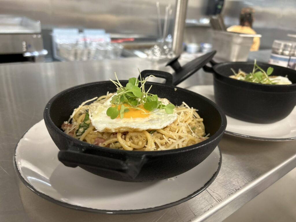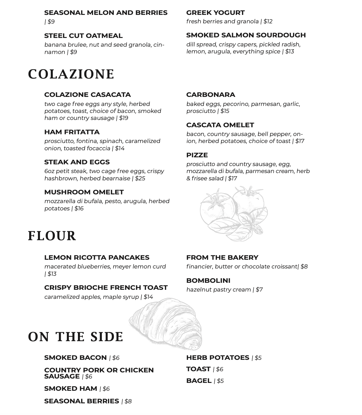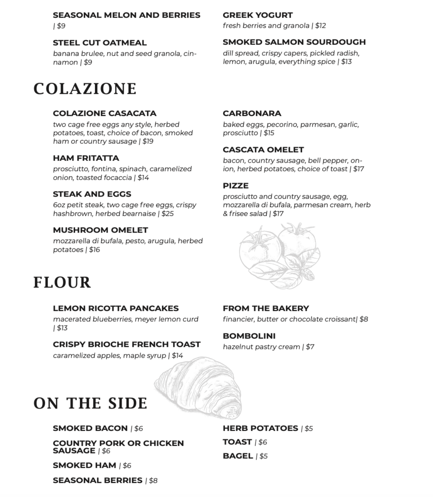 The breakfast menu features omelets, a frittata and breakfast pizza, plus signature dishes like lemon ricotta pancakes and a breakfast take on carbonara — with baked eggs, pecorino, parmesan, garlic and prosciutto.