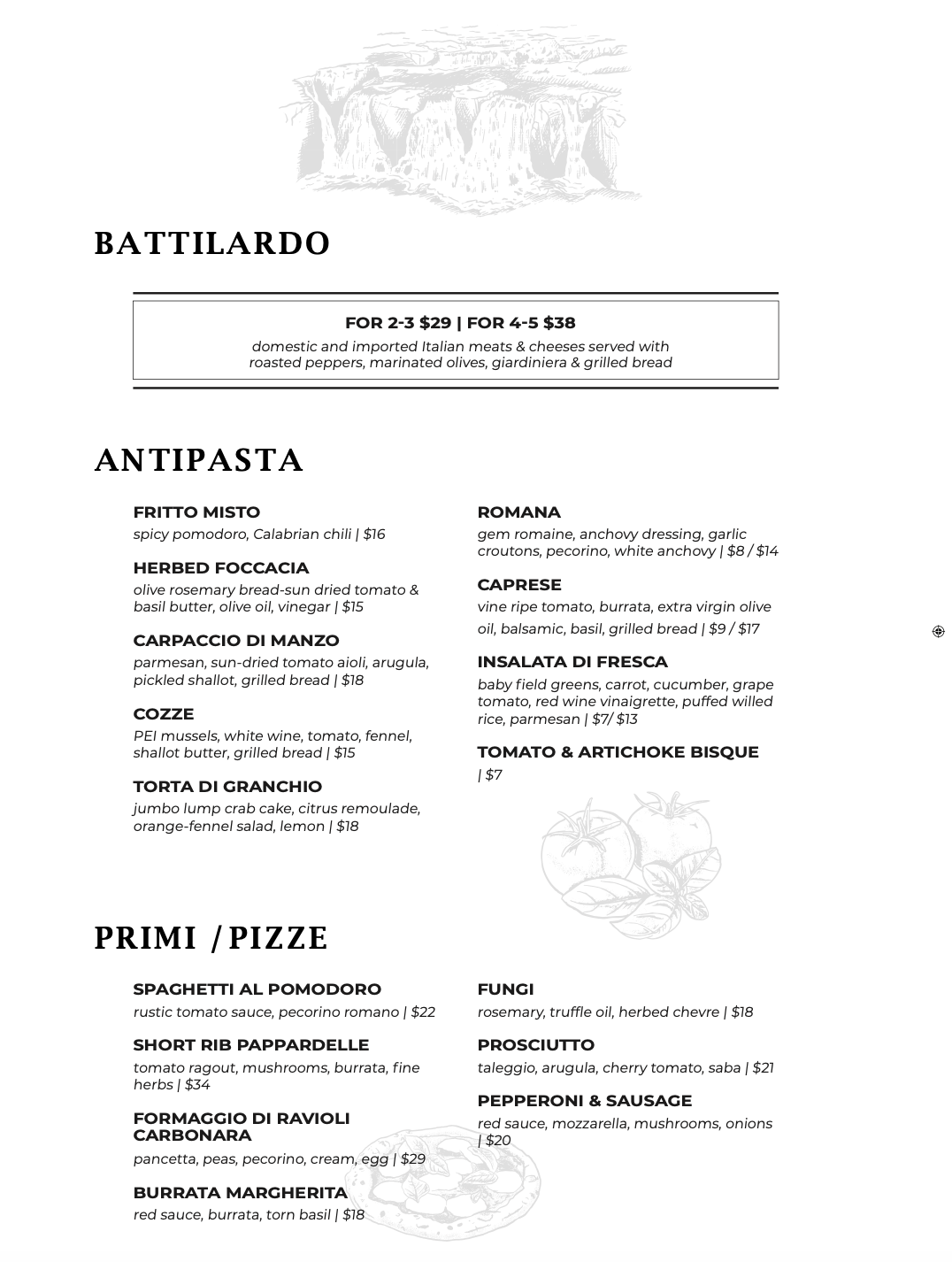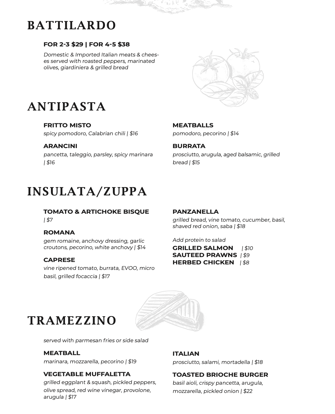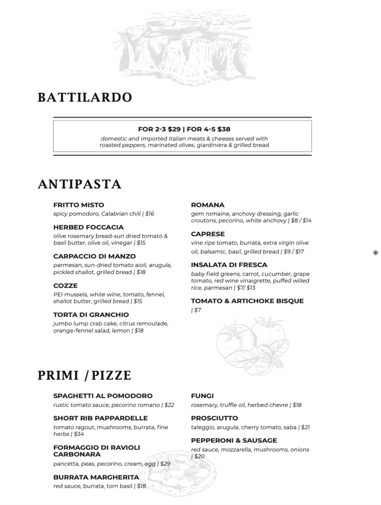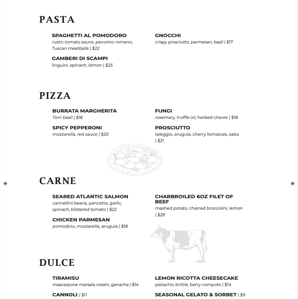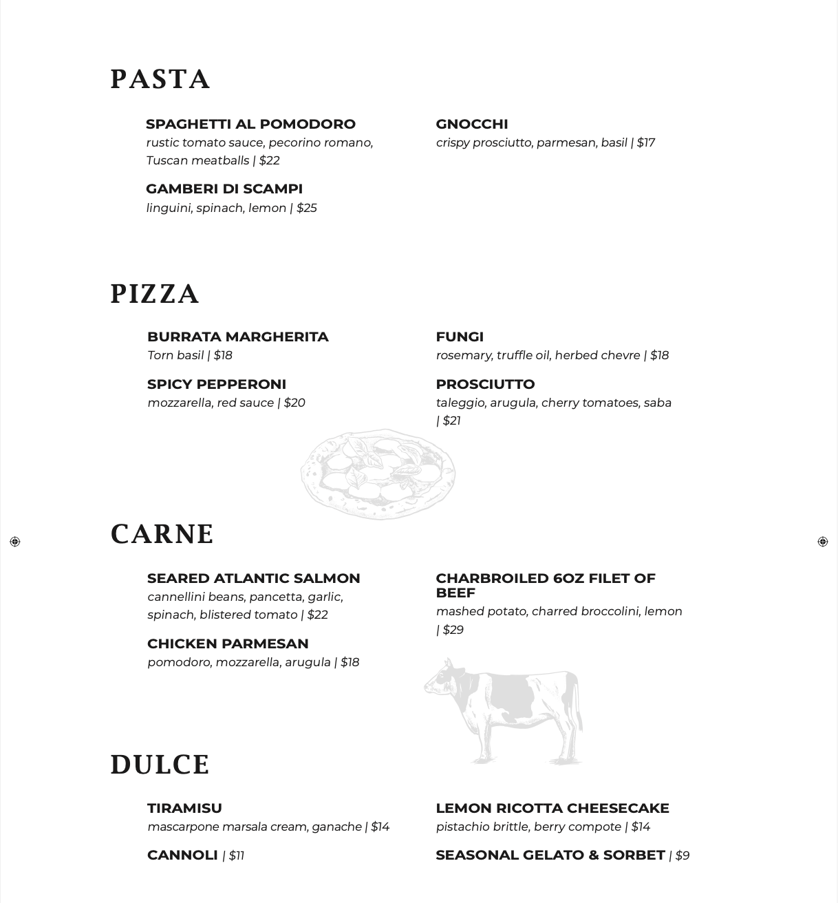 The dinner menu expands on the lunch menu, offering additional pizzas and pastas, along with multiple cuts of chargrilled steak, a Duroc pork chop, halibut and walleye.