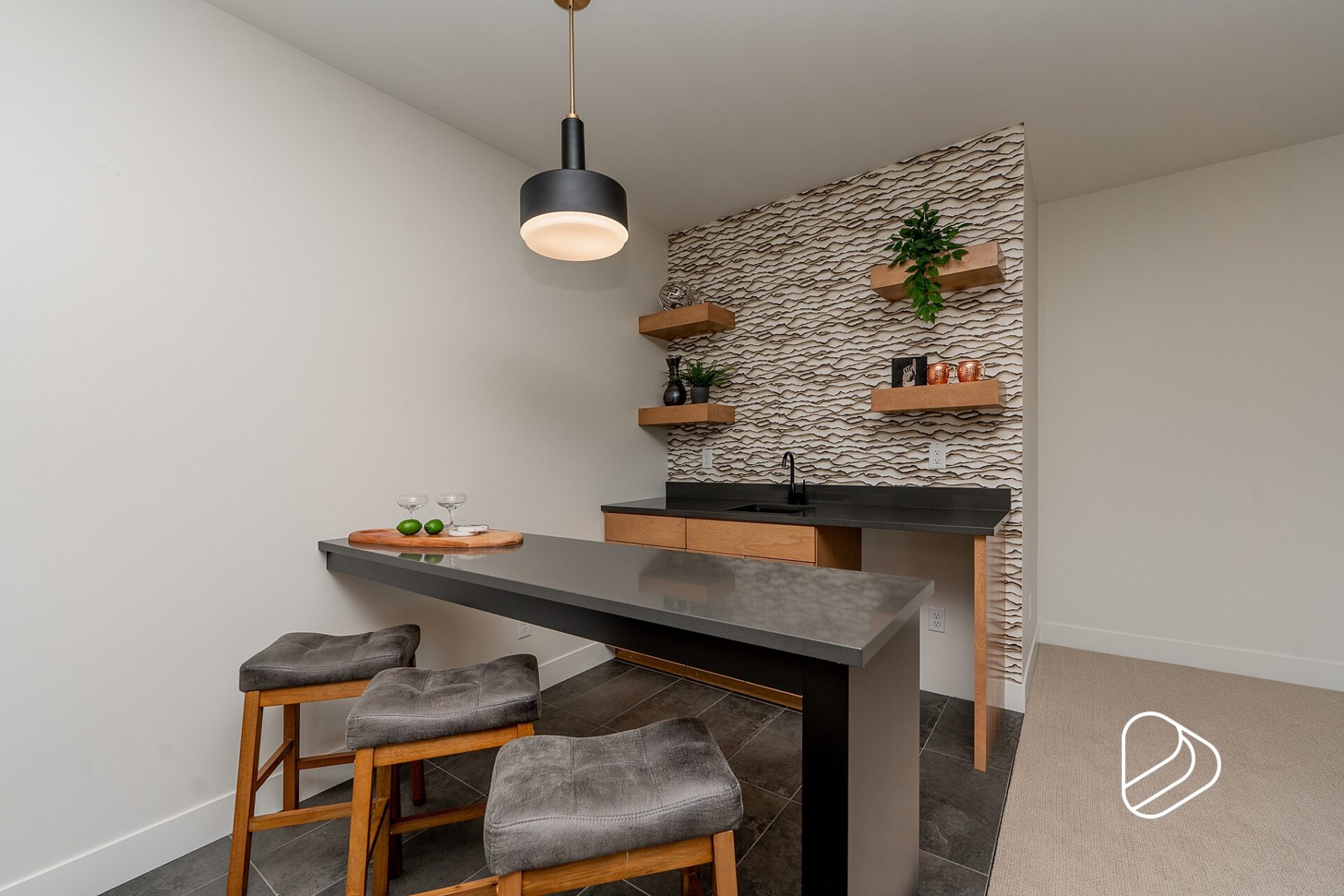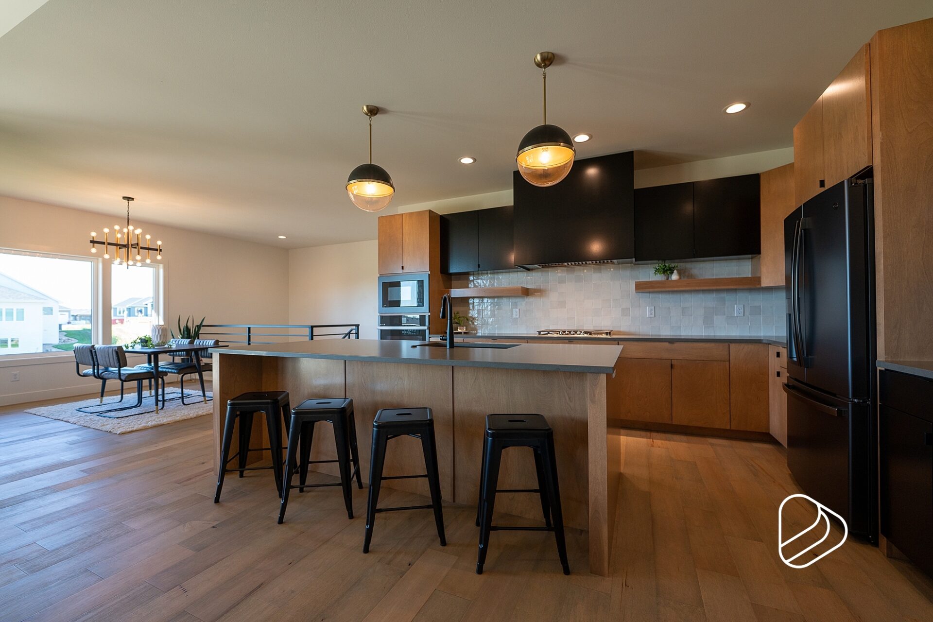 The main level totals 1,928 square feet and includes a kitchen featuring a large center island, tons of custom cabinetry and a tile backsplash.
