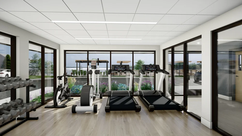 An outdoor infinity pool sits lakeside along with a hot tub and gas firepits, while the building includes an outstanding fitness center.