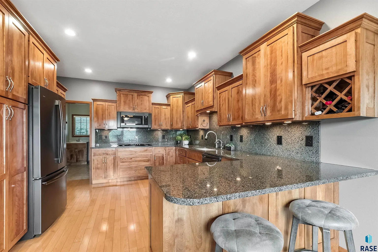 The open floor plan features a standout kitchen with granite counters, wood floors and high-end appliances.