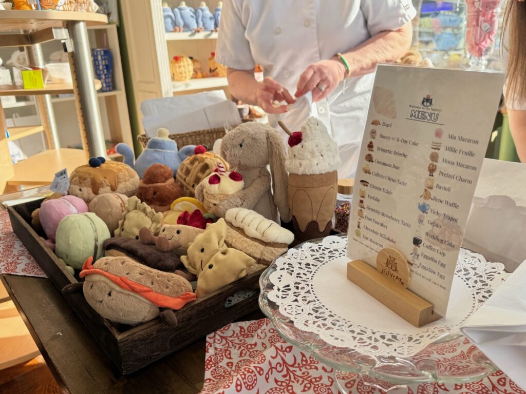 But until 2 p.m. today, the store also is hosting a “Jellycat Cafe” with plush pancakes, pickles, waffles, tarts, bagels, cinnamon buns, pretzels and more.