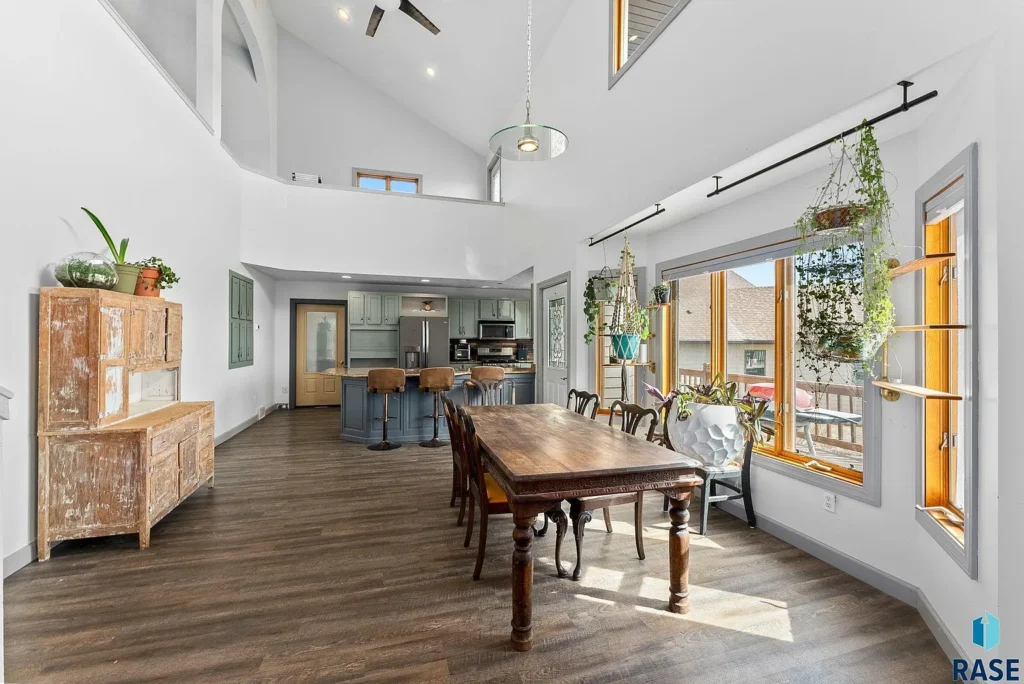 “The kitchen, living and dining space easily flow into one another, and the space is filled with vaulted ceilings and windows for tons of natural light.”