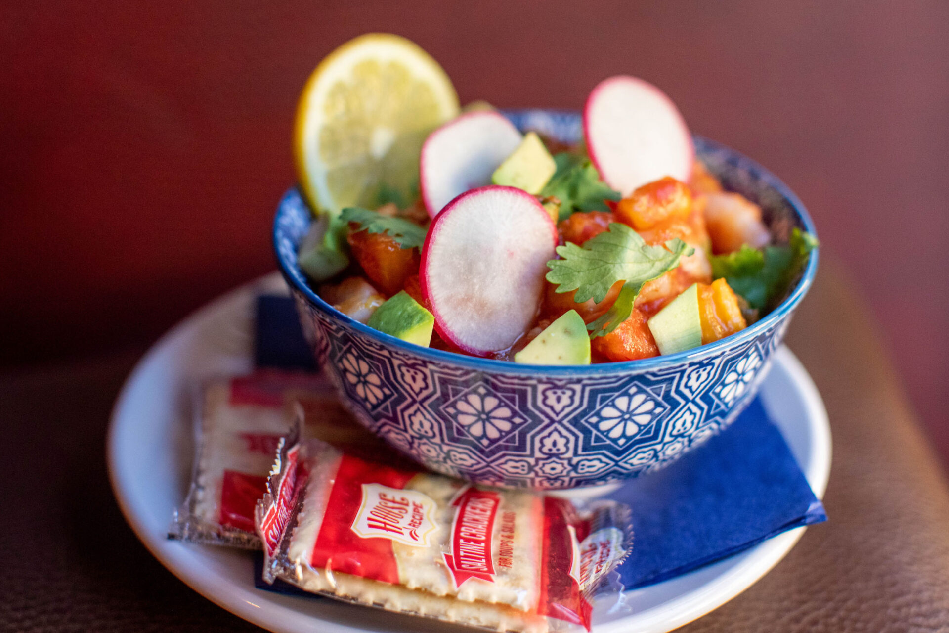 Other dishes include a signature shrimp cocktail, burrata and tomato, and charcuterie.