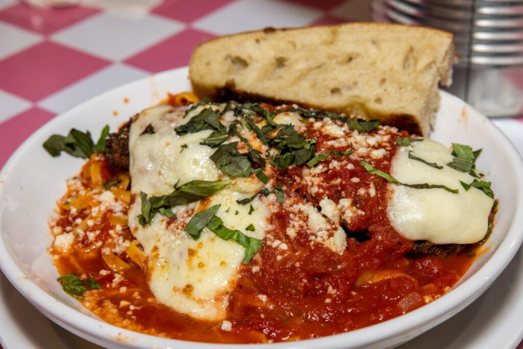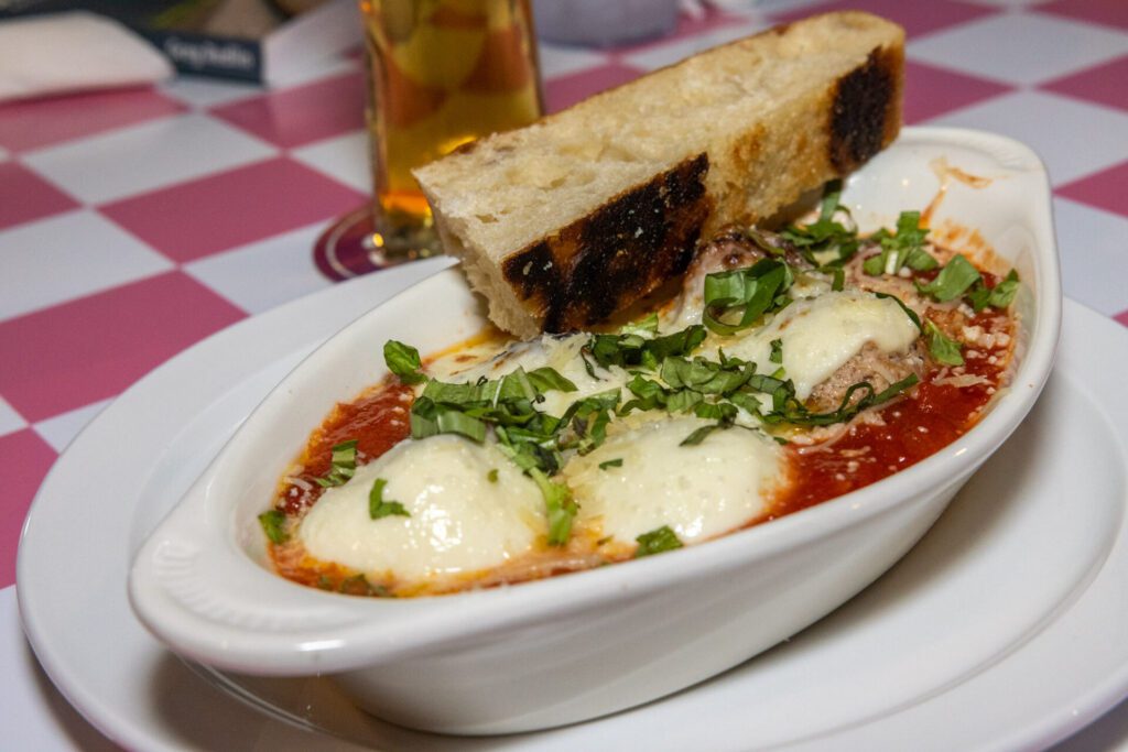 The house meatballs remain, featuring a combination of pork and beef, topped with marinara, fresh mozzarella, pecorino and basil, with a slice of focaccia.