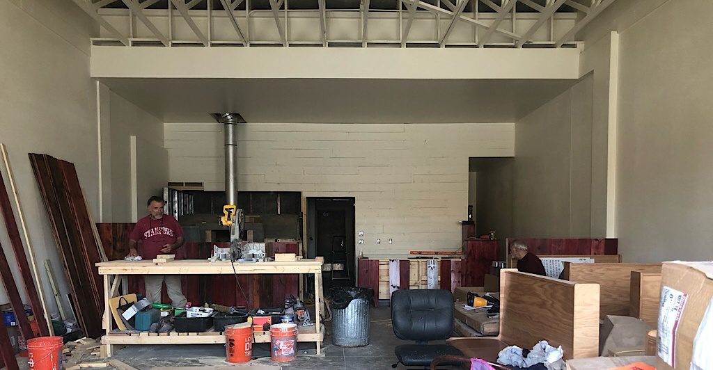 Dennis and Donald Napolitano work to build out the pizzeria space in August 2019.