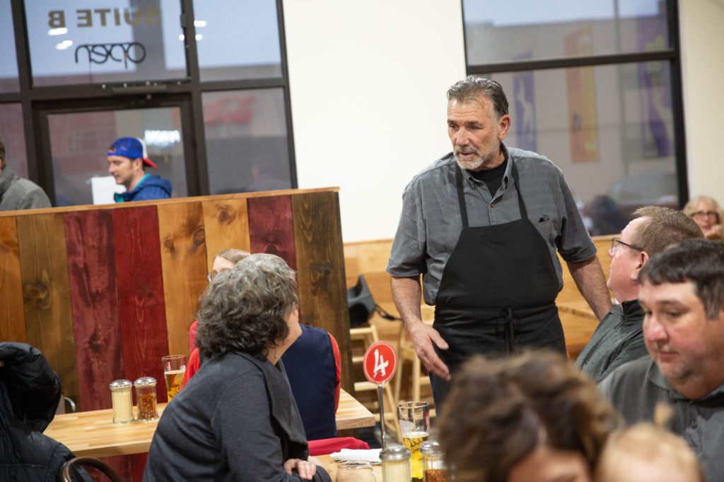 Dennis Napolitano visits with customers during a test run for Pizza di Paolo just before it opened in October 2019.