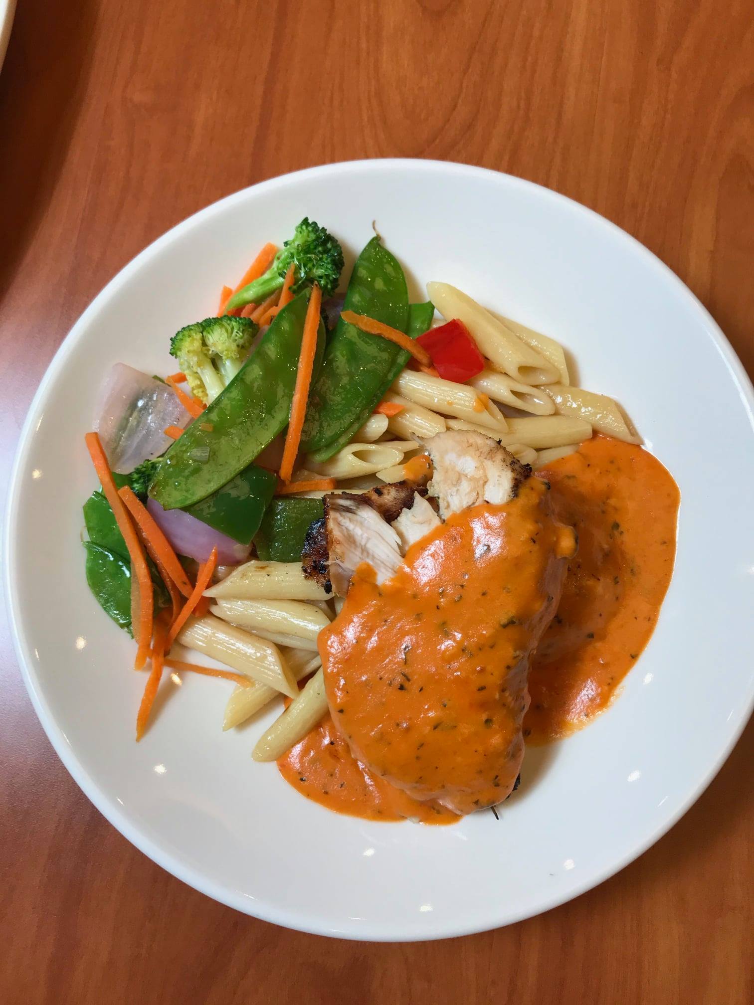 You can choose from a chicken breast prepared three ways, plus your choice of starch or vegetable.
