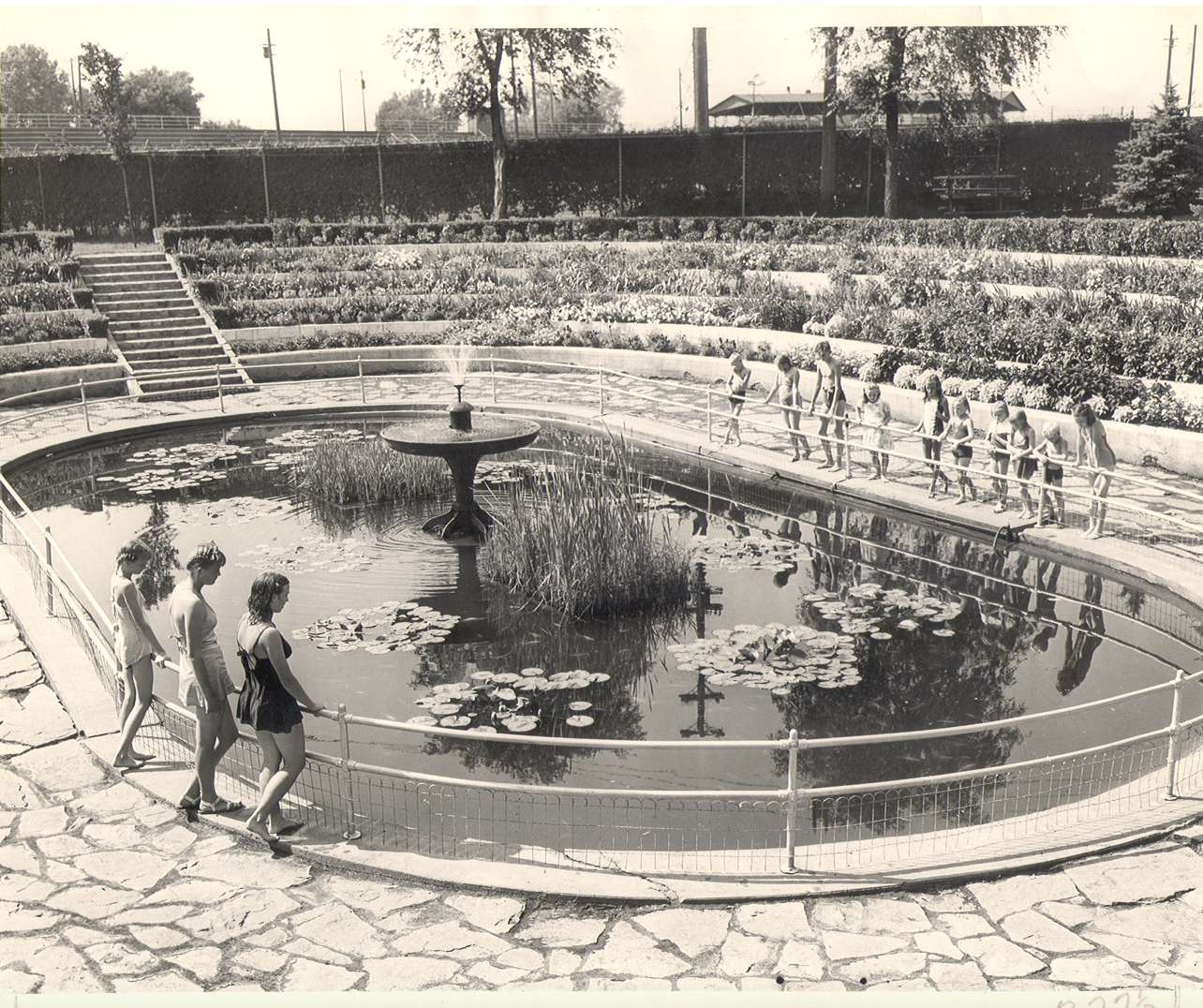 The history of the area goes back to 1888 when a natural spring was discovered. Drake Springs became the city’s first modern swimming pool in 1934, with water from the natural springs. A sunken garden was developed near the pool in the 1930s and was removed in the 1960s.