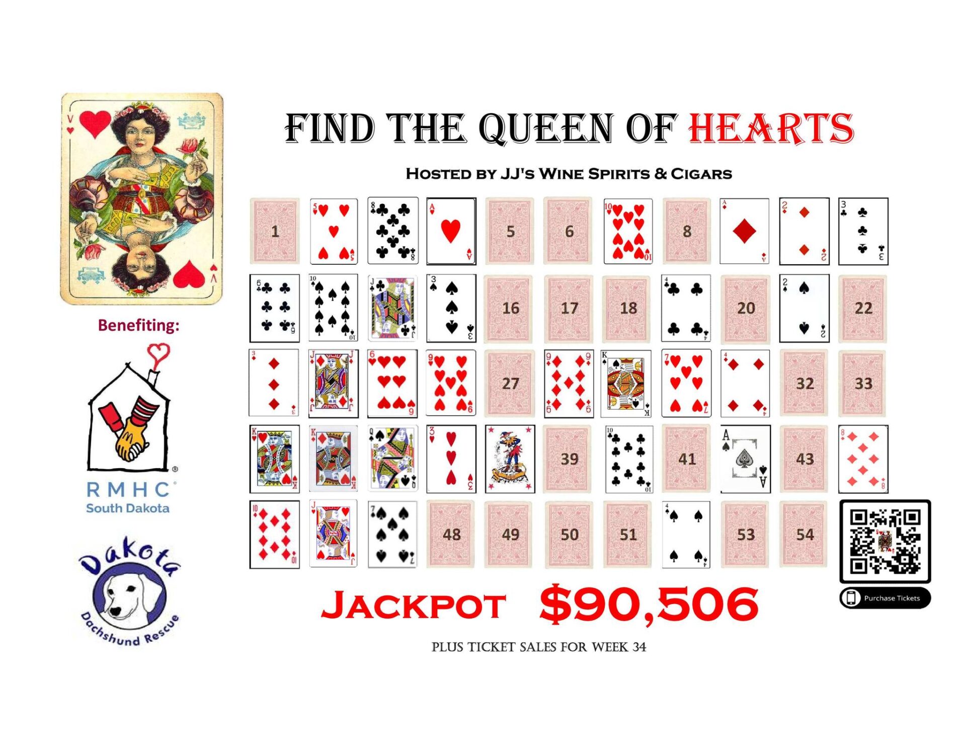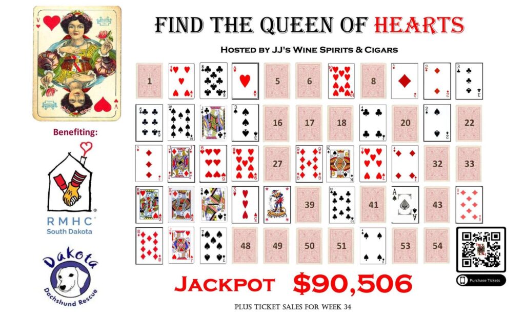 Purchase a ticket – they’re one for $5 or five for $20 – and then wait for the drawing. If you’re playing in person or online, you choose a card on the board. If it’s the Queen of Hearts, you win the jackpot! You can play as many times as you want.