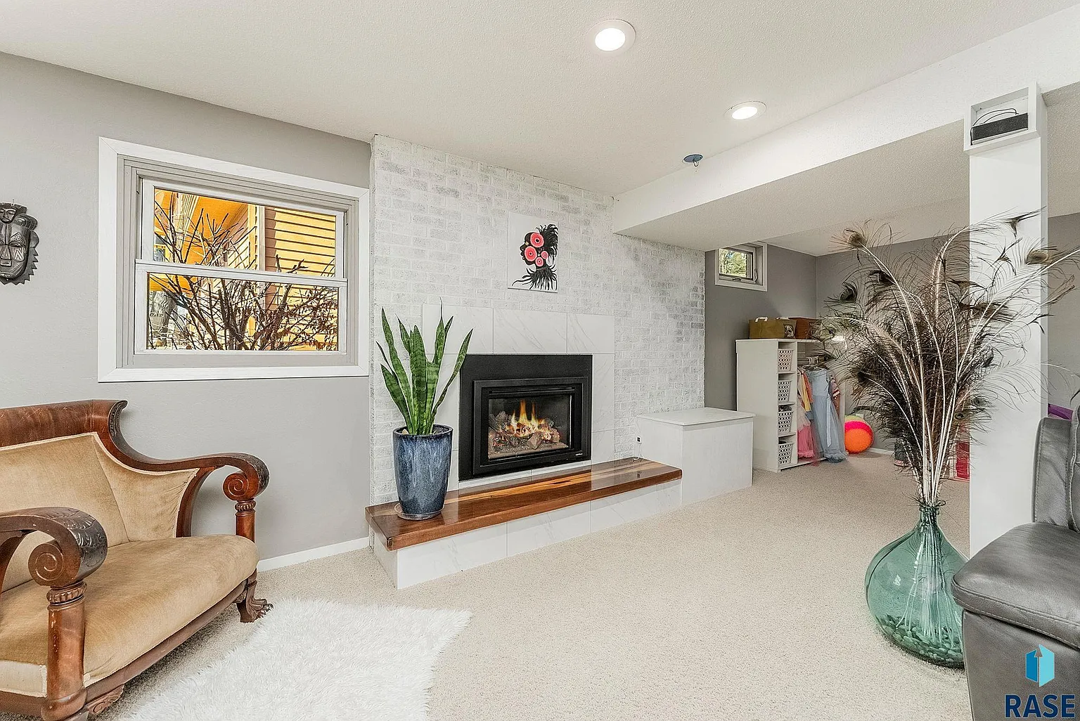 The lower level features a stunning gas fireplace and walnut hearth that changes color for added atmosphere.