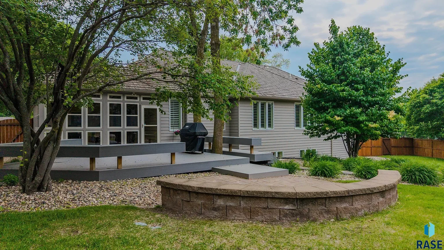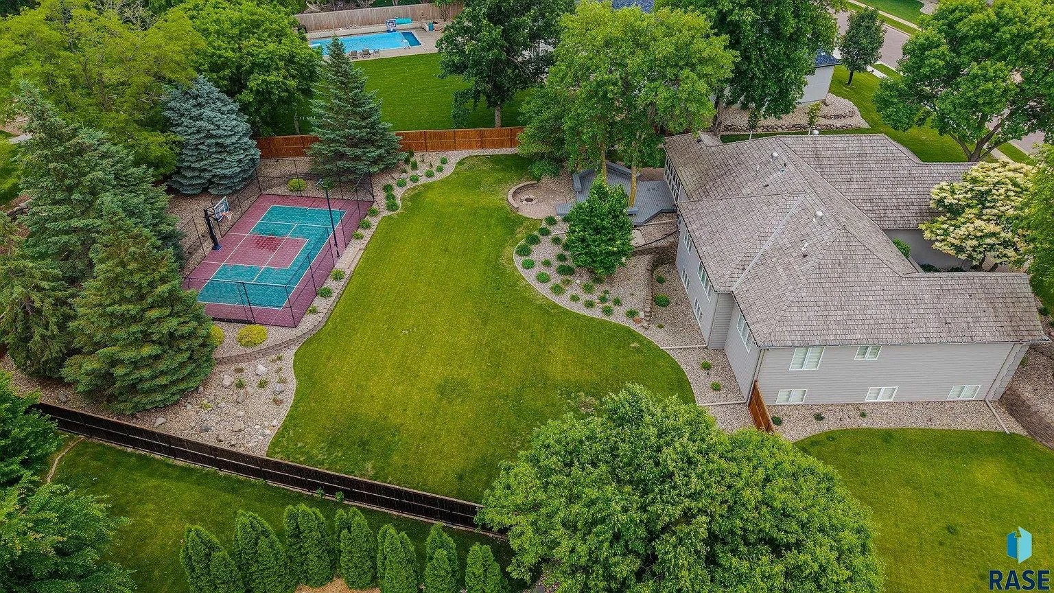 “A three-season patio offers nearly year-round outdoor living while an outside deck and sport court complete the landscape.”
