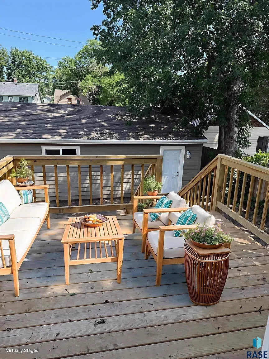 A large backyard deck and a fenced yard offer easy access to an oversized detached two-car garage.