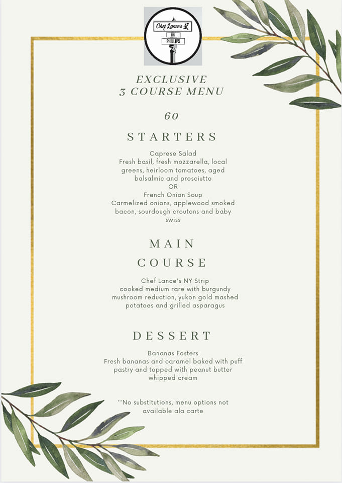Chef Lance’s on Phillips is offering a three-course meal for $60 every Thursday night in December in addition to its regular menu. Diners can choose a caprese salad or French onion soup for a starter. The main course is a New York strip, and dessert is bananas Foster. Update: The menu will change for next week and may be different every time.