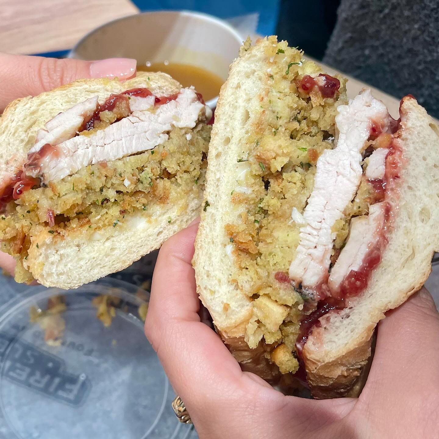 Firehouse Subs is featuring the Thanksgiving Turkey Sub for a limited time. It includes carved slices of turkey breast, stuffing, cranberry sauce and mayo on a toasted sub roll.