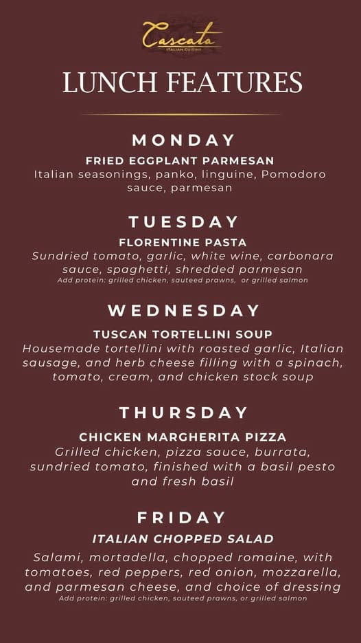 Cascata Italian Cuisine has new daily lunch features.