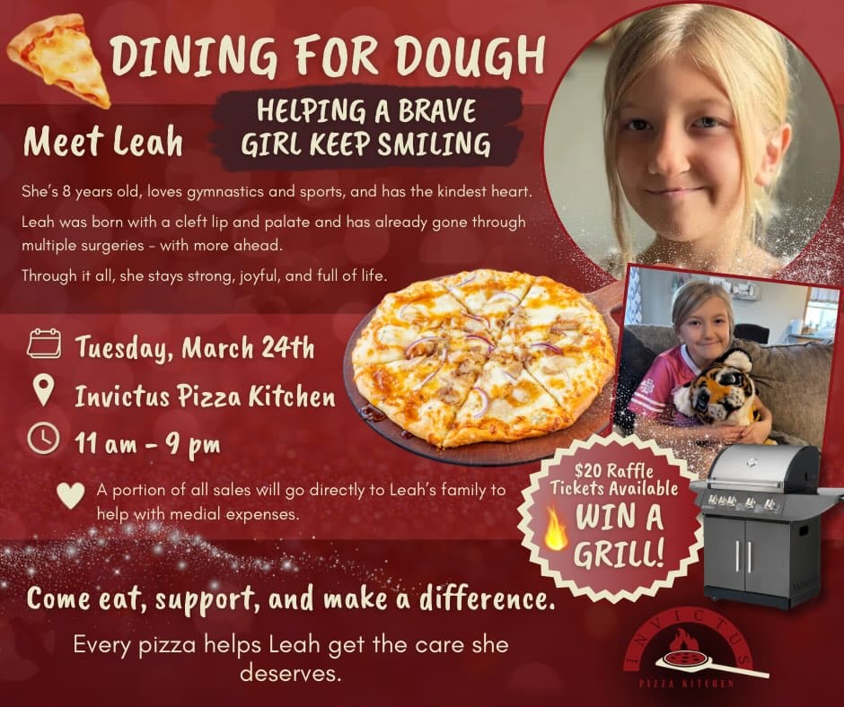 Invictus Pizza Kitchen is donating a portion of sales Tuesday to help with medical expenses for 8-year-old Leah who was born with a cleft lip and palate. She has had multiple surgeries and has more ahead.