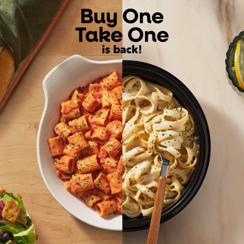 Olive Garden’s “buy one, take one” promotion is back for a limited time. Buy an entree from a list of seven options, and get one of three chilled meals to enjoy later. Options for the second entree include fettucine alfredo, five-cheese ziti al forno and spaghetti with meat sauce.