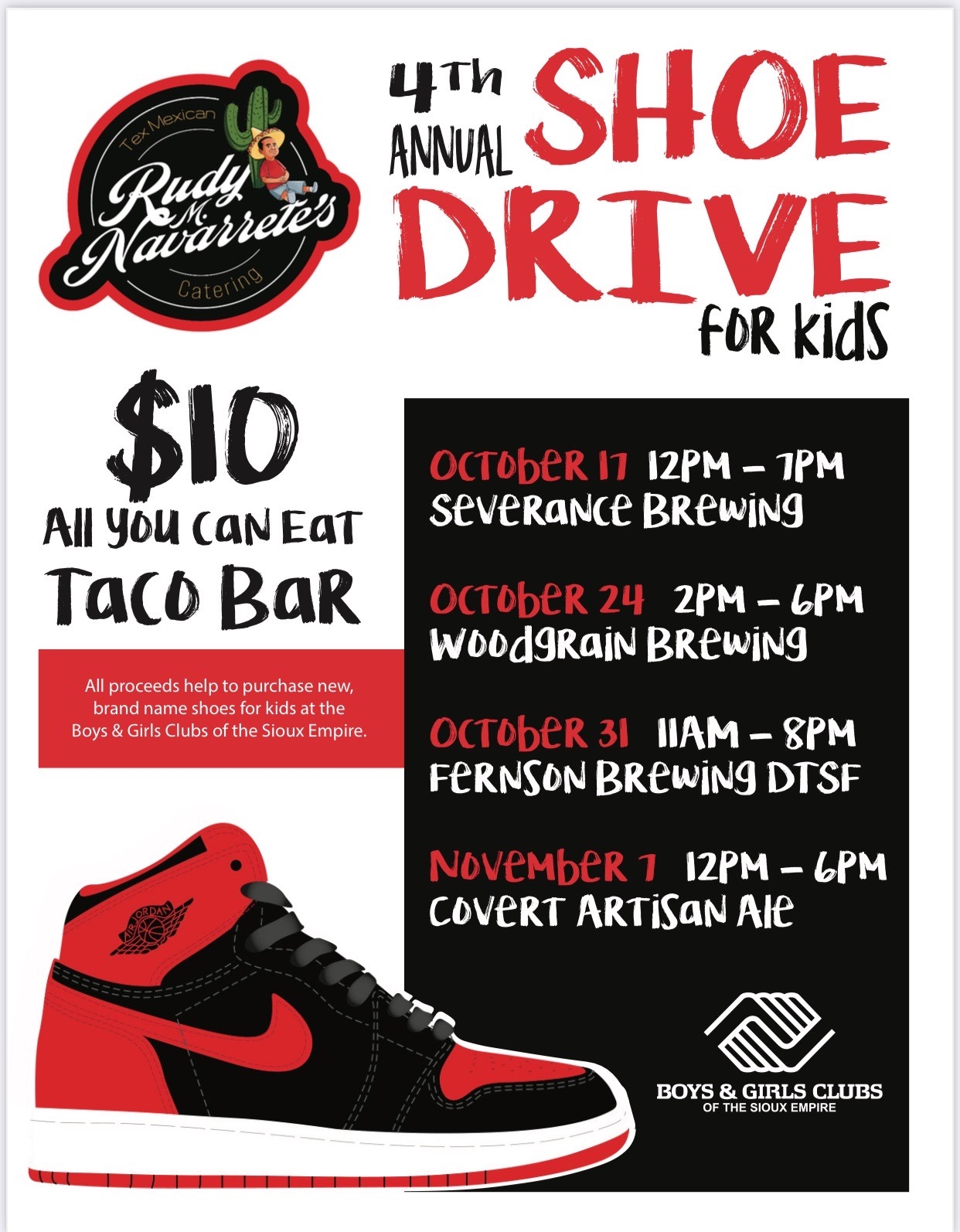 Rudy M. Navarrete’s Tex-Mexican Catering is teaming up with several downtown breweries to offer a taco bar fundraiser for Navarrete’s fourth annual shoe drive. Navarrete, who also operates Rudy’s Taco Bus, raises money every year to buy name-brand tennis shoes for kids at the Boys & Girls Clubs of the Sioux Empire. Donate at least $10 for an all-you-can-eat meal. Here are the dates and locations: Sunday, noon to 7 p.m. at Severance Brewing Co.; Oct. 24, 2 to 6 p.m. at WoodGrain Brewing Co.; Oct. 31, 11 a.m. to 8 p.m. at Fernson Downtown; Nov. 1, noon to 6 p.m. at Covert Artisan Ales & Cellars.
