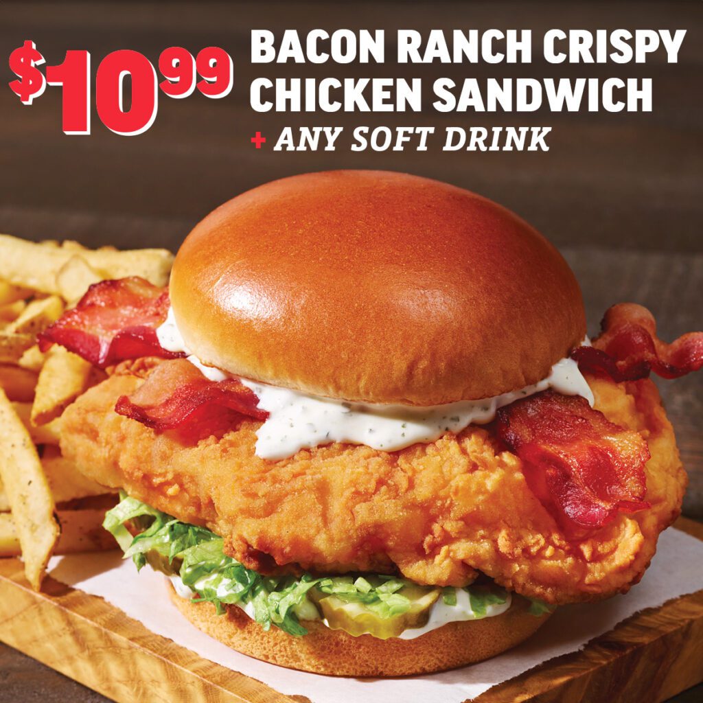 Applebee’s has three new crispy chicken sandwiches: Bacon Ranch, Sweet & Spicy and Bacon Cheddar. Through Sunday, for dine-in only, get the Bacon Ranch version with fries and a soft drink for $11.