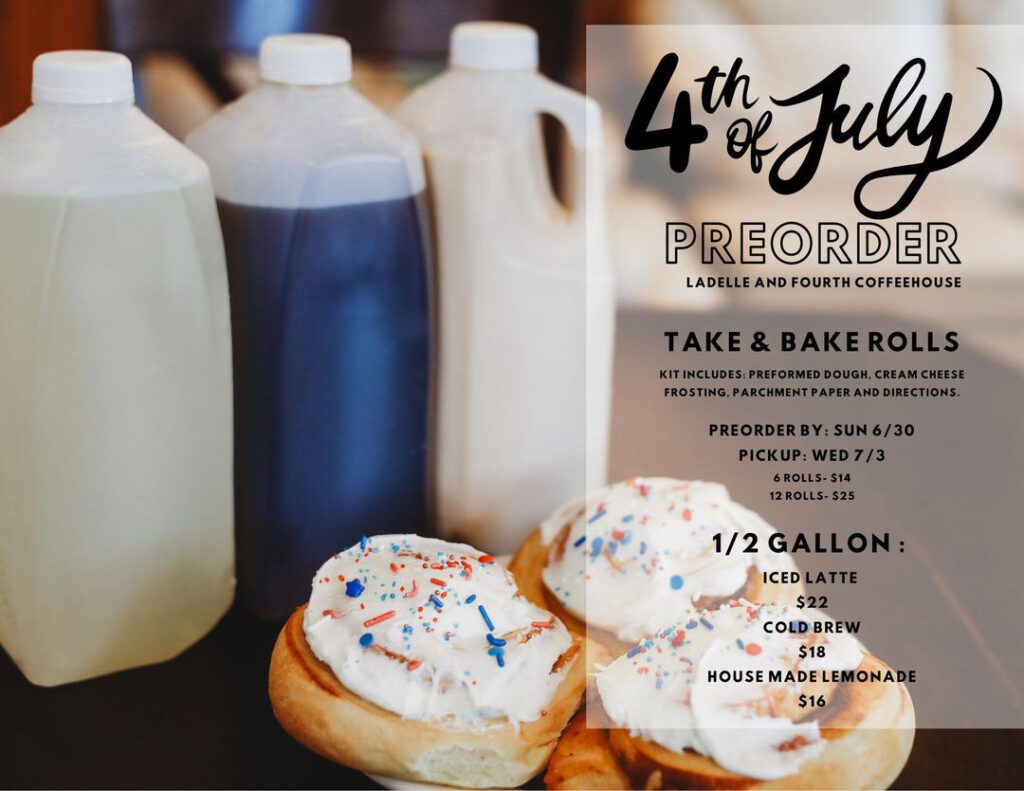 LaDelle and Fourth Coffeehouse in Dell Rapids is offering its take-and-bake cinnamon roll kits for the Fourth of July. Order a half-dozen or dozen by Sunday for pickup Wednesday. Half-gallon iced lattes, cold brew and housemade lemonade also are available.