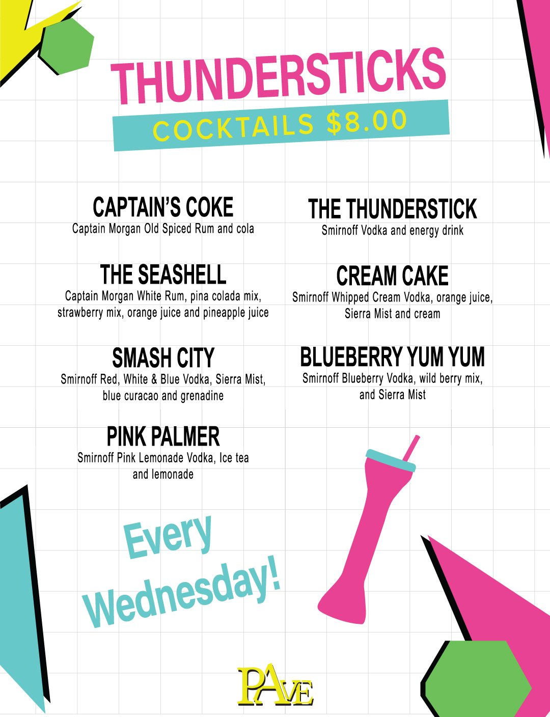 If you’re tired of the same old summer cocktails, PAve has new ones to try on Wednesdays. The 24-ounce “Thunderstick” drinks come in seven varieties.