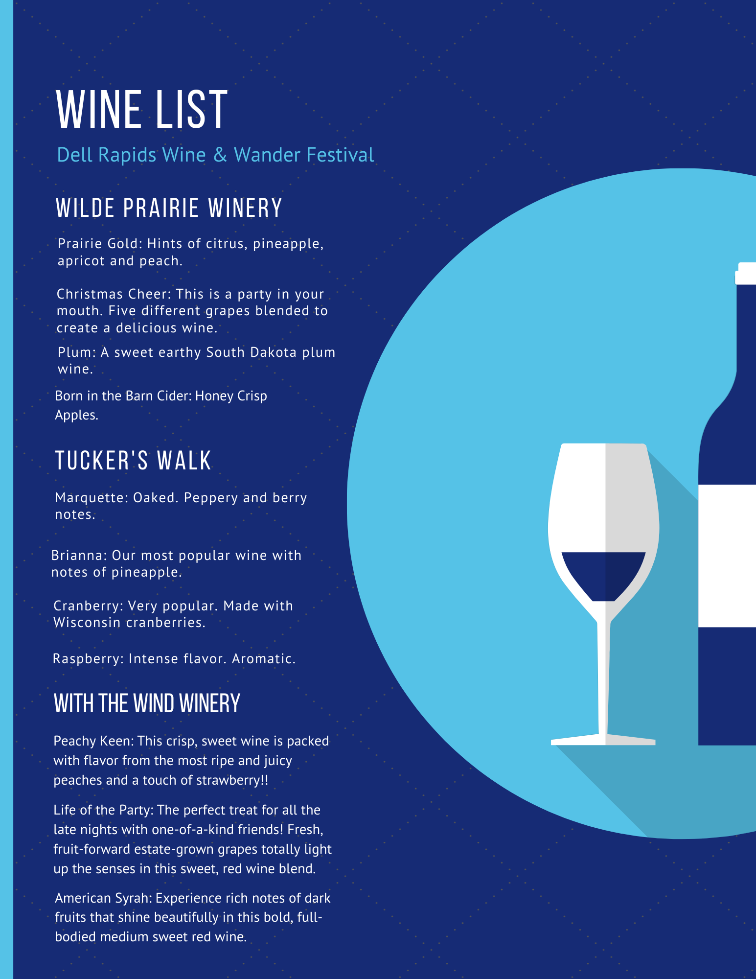 The annual Dell Rapids Wine & Wander is Friday. The event is downtown on the street filled with historic quartzite buildings. Enjoy South Dakota wines, local craft beer, food, live music and activities. Hours are 4 to 7 p.m. Here’s just a sampling of the wines that will be available.