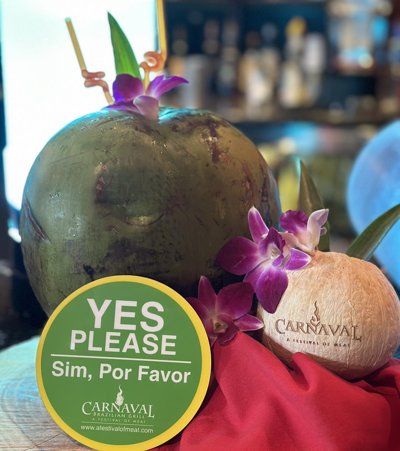 Carnaval Brazilian Grill now sells natural coconut water in an actual coconut that you can take home. Customers also can order any drink of their choice and have it served in a coconut.