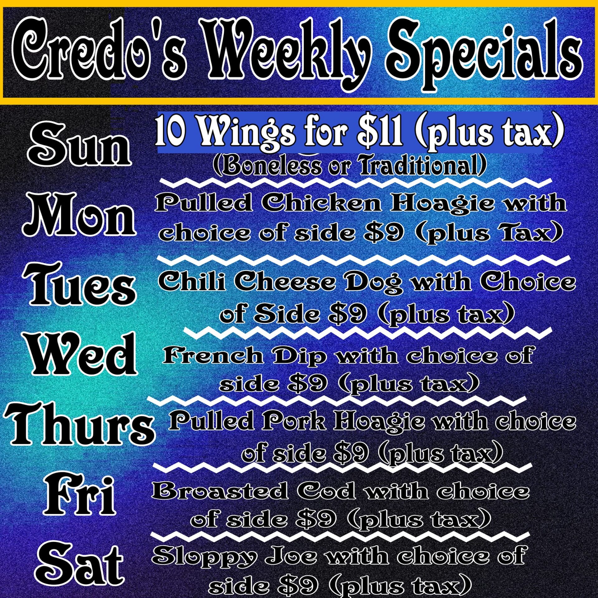 Credo’s Pub changes up its daily specials every now and then. Here are the latest offerings.