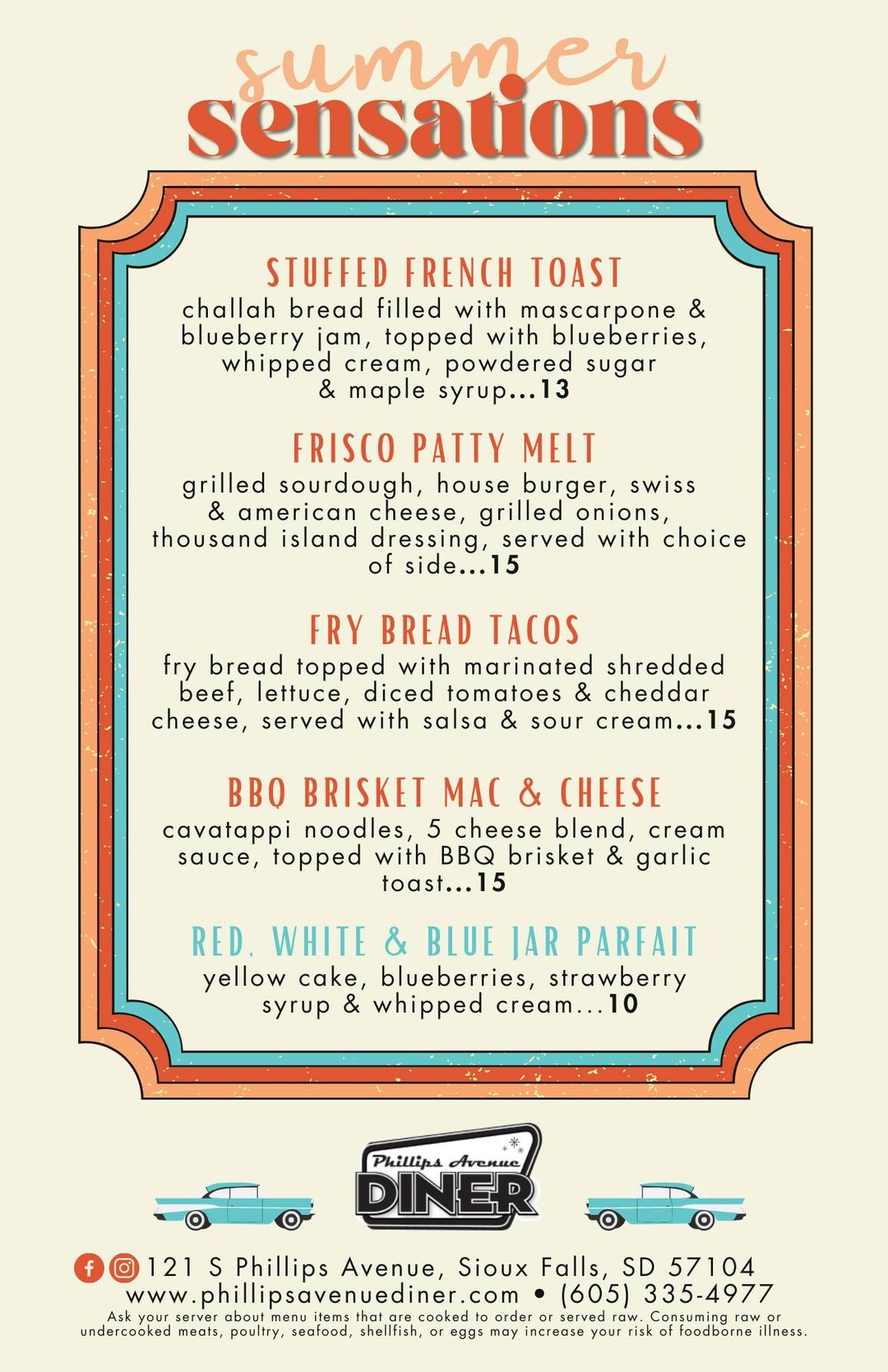 Four new entrees, including a fry bread taco, and a dessert are on the Summer Sensations featured menu at the Phillips Avenue Diner.