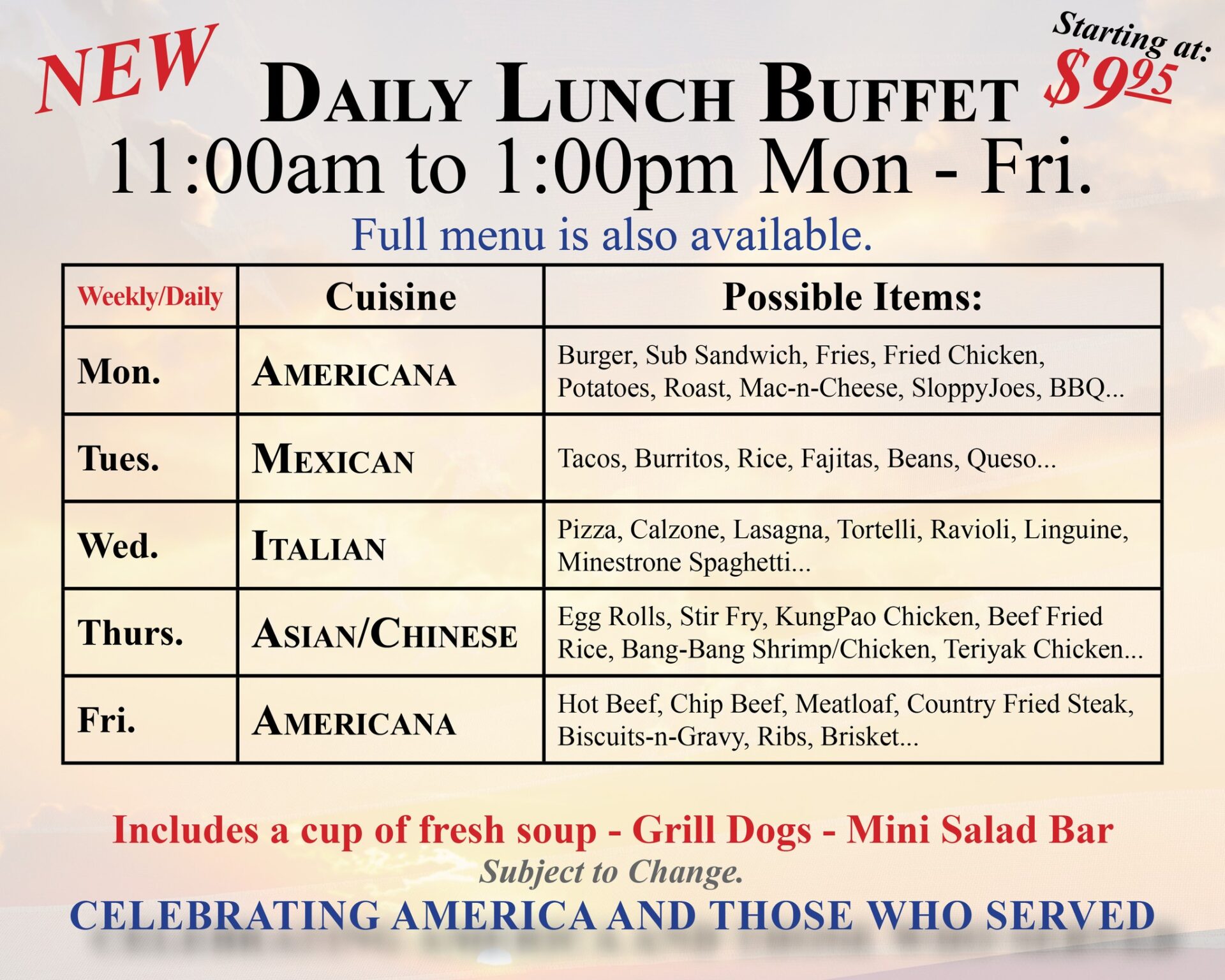 The Patriot Grill in the South Dakota Military Heritage Alliance has categorized its daily buffet to give customers a better idea of what might be served that day. Here’s the new lineup.
