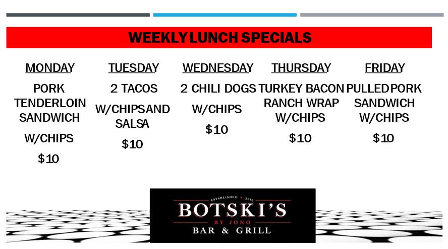 Botski’s Bar & Grill has added weekday lunch hours. It opens at 11 a.m. and features daily specials in addition to the regular menu. Botski’s also offers $1 off all beer and wine until 6 p.m. weekdays.