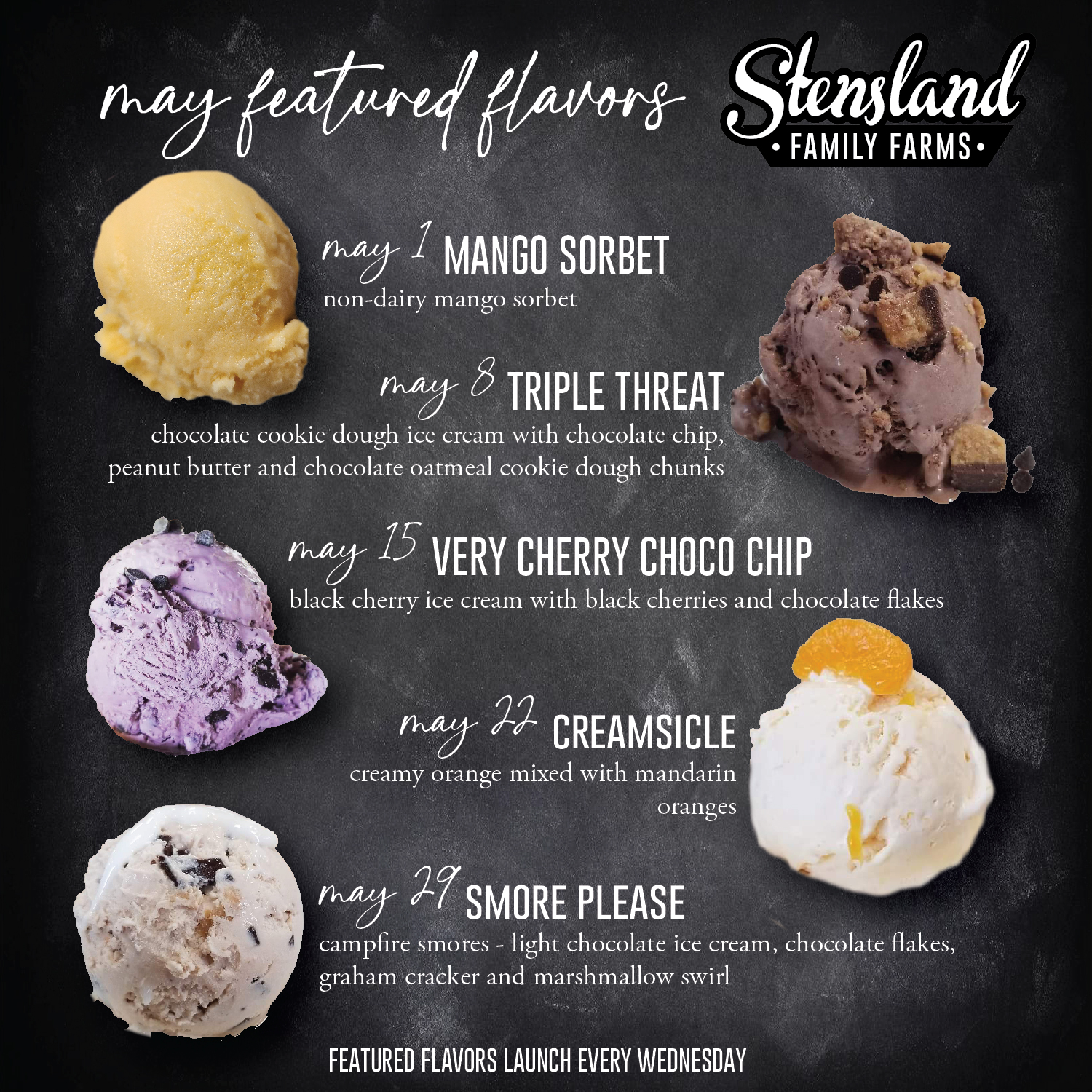 Here are the featured ice cream flavors for May at Stensland Family Farms. They’re added to the dipping case every Wednesday.