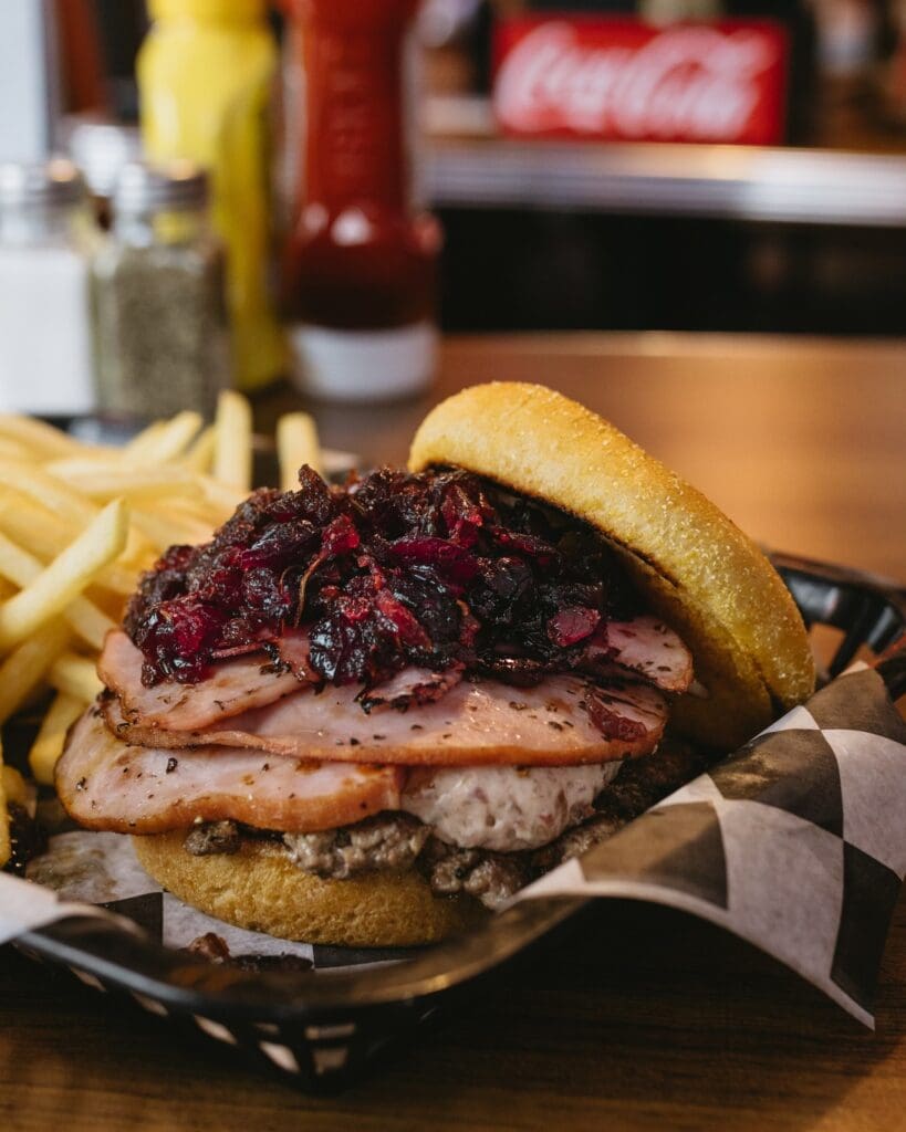 The burger of the month at Big Sioux Burger is Cranny Hammy. A cornbread bun is topped with candied pecan and cranberry cream cheese, a smash patty, peppered ham and jalapeno cranberry chutney.