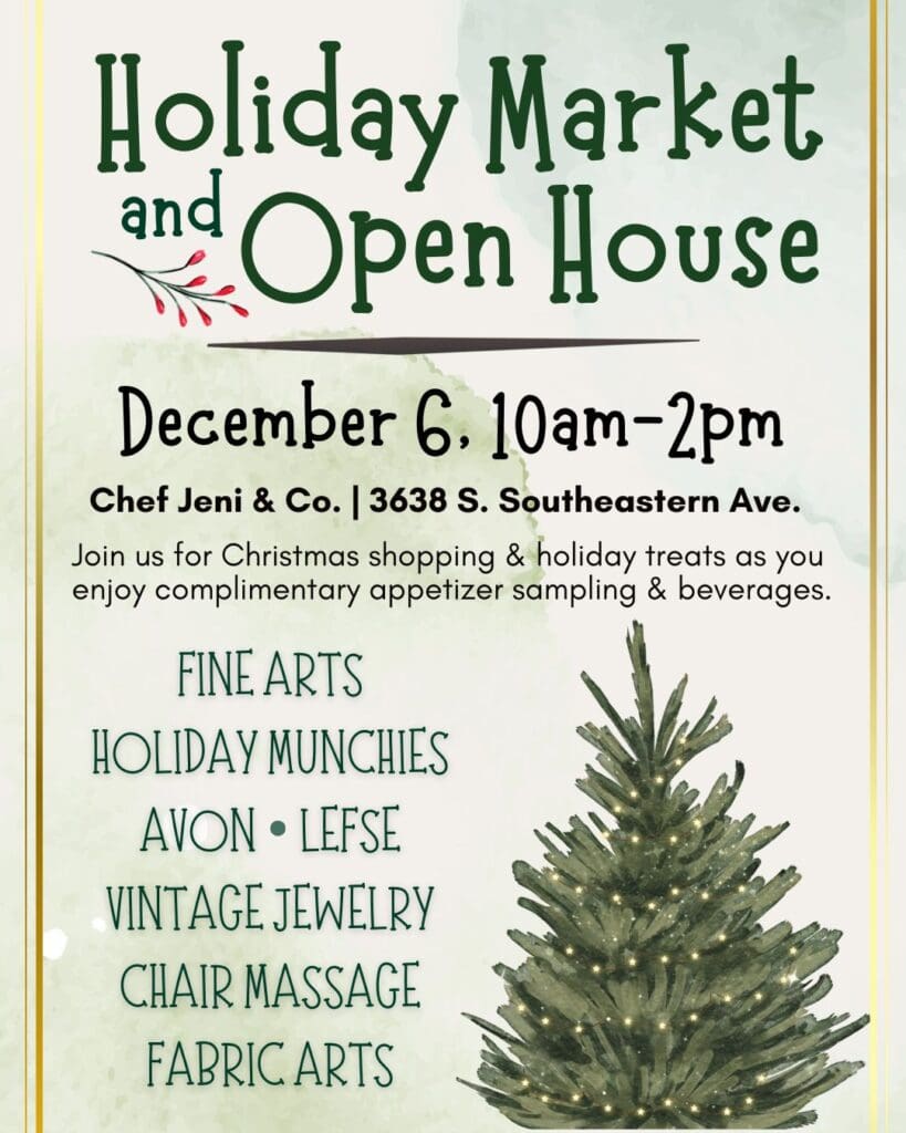 The annual holiday market and open house from Chef Jeni & Co. is from 10 a.m. to 2 p.m. Saturday. Stop by the kitchen and event space at 3638 S. Southeastern Ave. to shop holiday munchies and goods from other small businesses. Complimentary appetizer samples and beverages will be served.