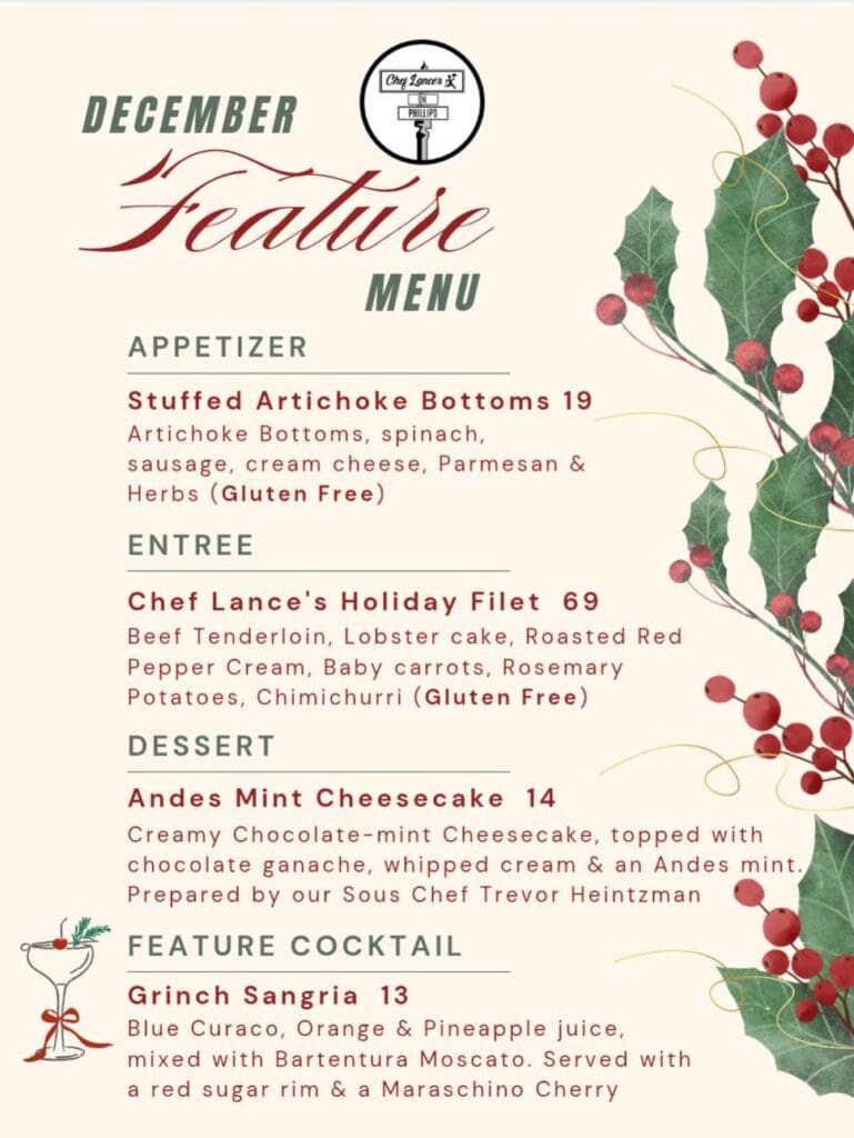 Here’s the feature menu for December at Chef Lance’s on Phillips.